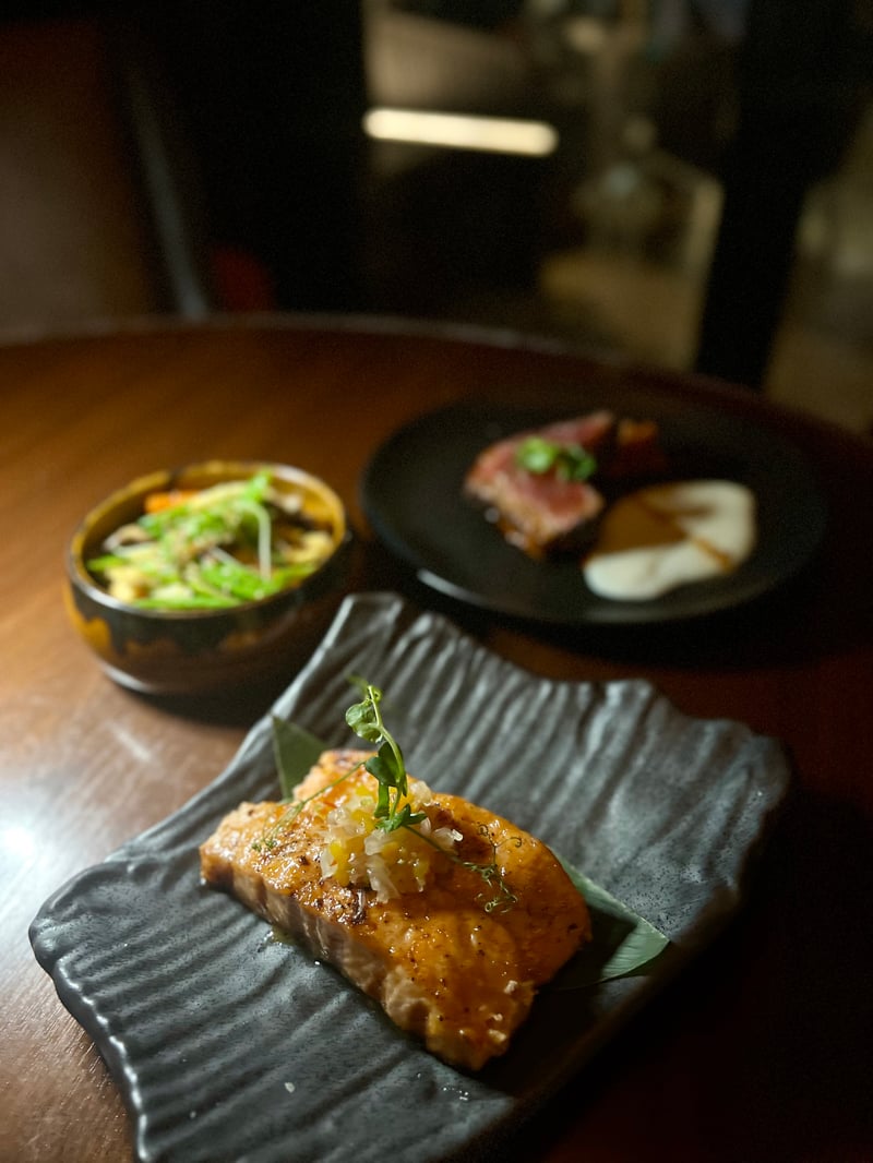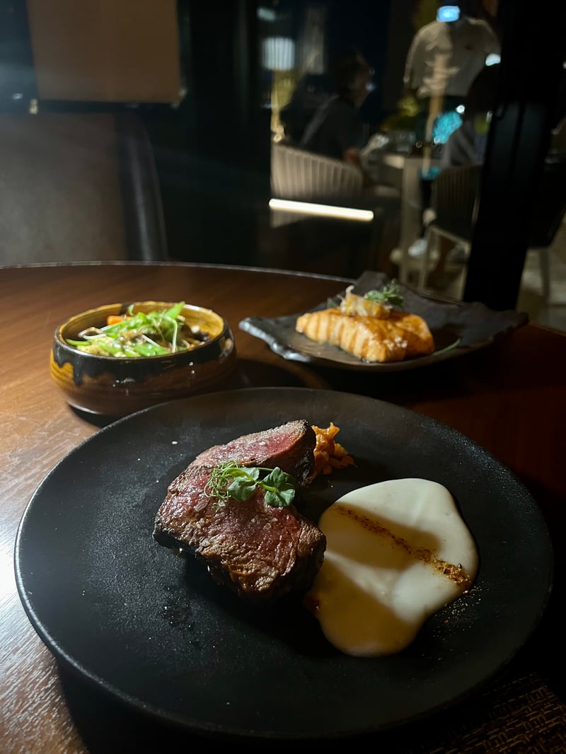 We then savored a Wagyu Roll as tender as it was flavorful, where the richness of lightly seared beef met the freshness of avocado and the delicacy of shiso leaf, all enhanced by a well-balanced yakiniku sauce. The Sake-Amamiso offered a perfectly balanced sweet and savory explosion thanks to the mild miso, tender salmon, and an exotic mango and pomelo salsa. For the main course, the Niku Anticuchero won us over with the tenderness of its beef fillet and the originality of its sides: a creamy coconut purée, surprising fennel kimchi, and a boldly flavored anticuchera sauce. Everything paired beautifully with simply yet perfectly executed fried vegetables.
