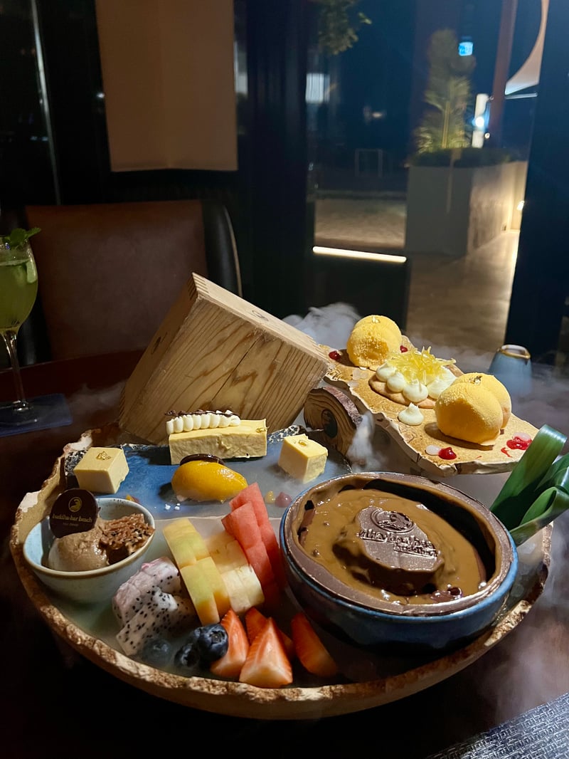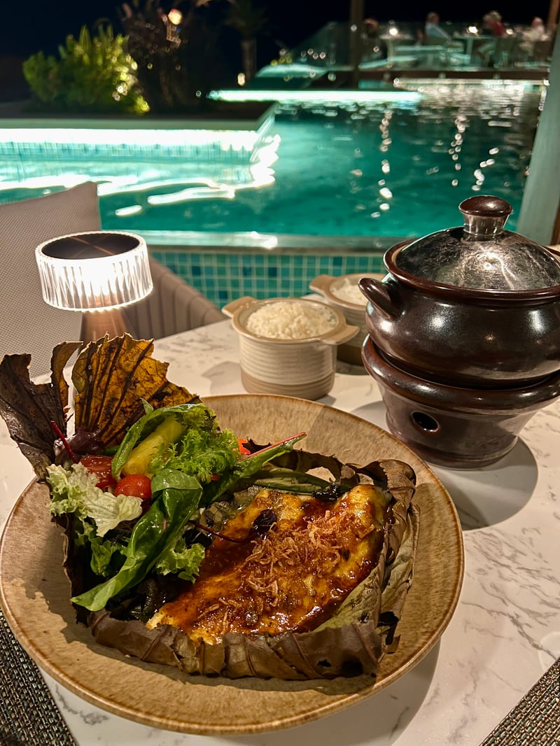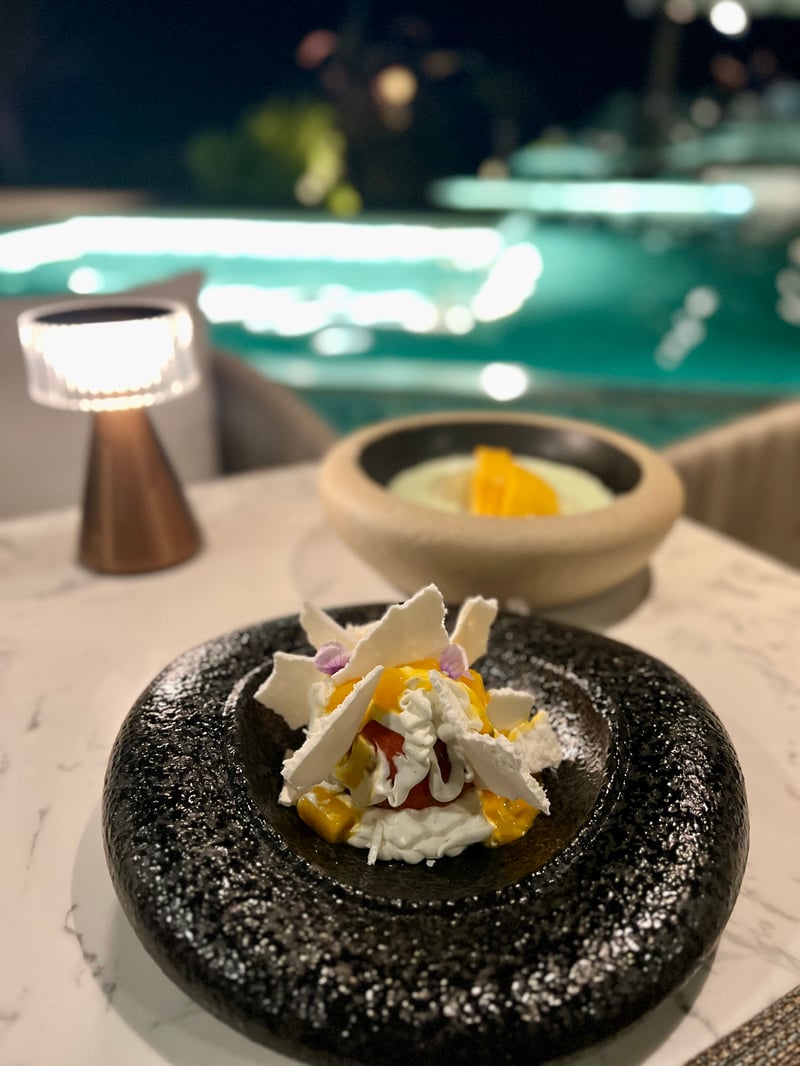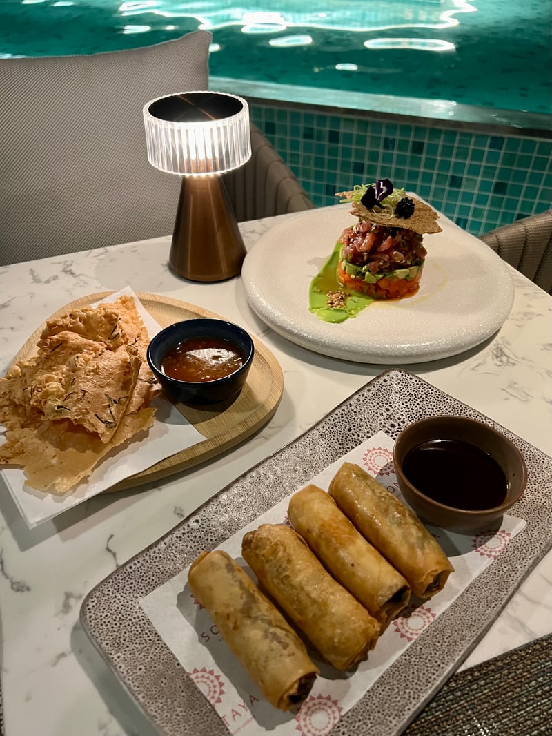 Set in an enchanting setting of glass pavilions on stilts, bathed in shimmering water reflections and soft lighting, the Sontaya restaurant treated us to a romantic dinner with Southeast Asian accents. We started with a very fresh Indonesian tuna tartare, delicately enhanced by a pickled ginger vinaigrette and elevated by creamy avocado, sweet papaya, and crunchy quinoa. The duck spring rolls, generously filled with roasted meat, leeks, and vermicelli, were served with a fragrant hoisin sauce, for an appetizer that was both crispy and flavorful.