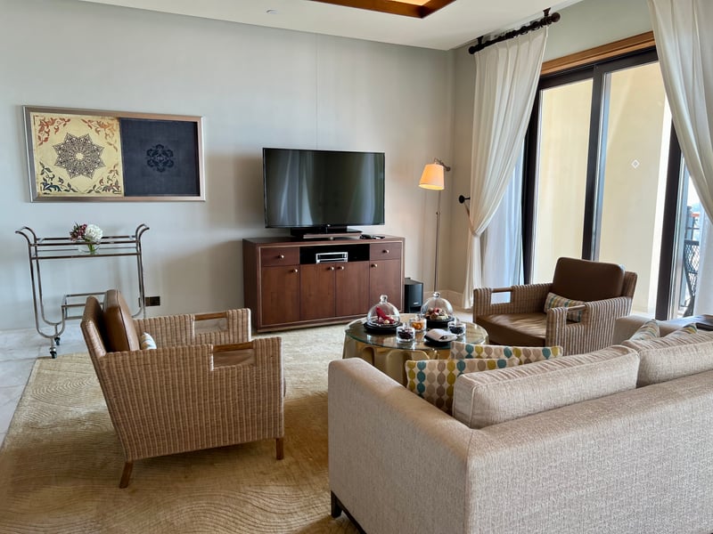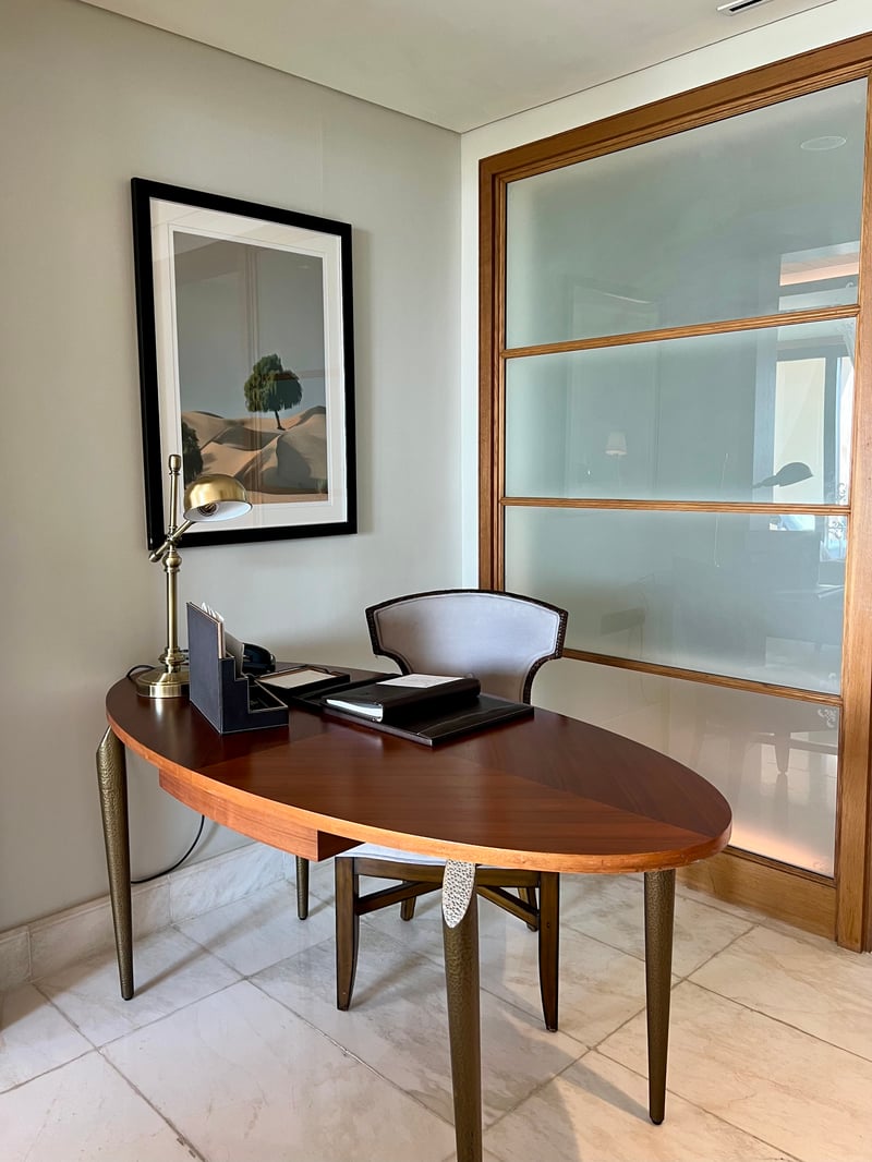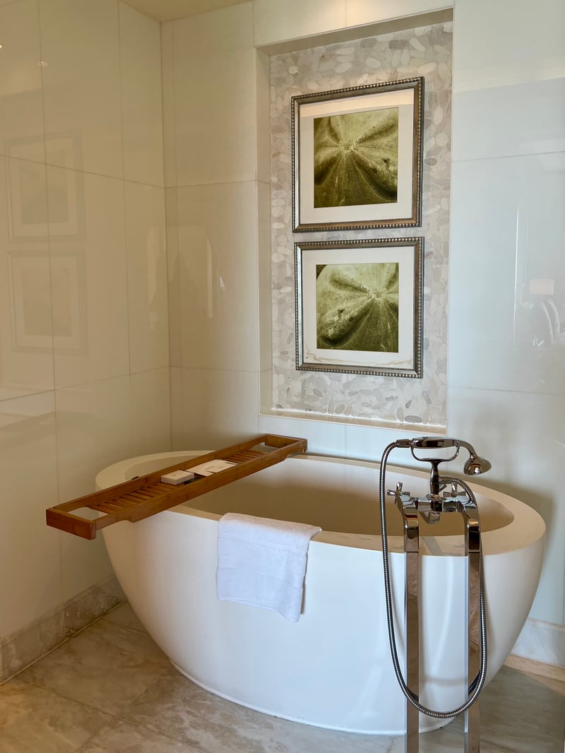 During our stay, we had the pleasure of discovering the St. Regis Suite, a spacious 80 m² haven combining elegance and intimacy. Comprising a large bedroom with a king-size bed, a separate living room, and a furnished balcony, this suite provides a sumptuous setting for a relaxing escape. The contemporary furniture with soft lines harmoniously integrates into a decor of smooth marble, natural wood, and high-end fabrics. The bathroom features a deep bathtub, a rain shower, and luxurious amenities. It's a true invitation to slow down time, soothed by the tranquility of the place and the excellence of the service.