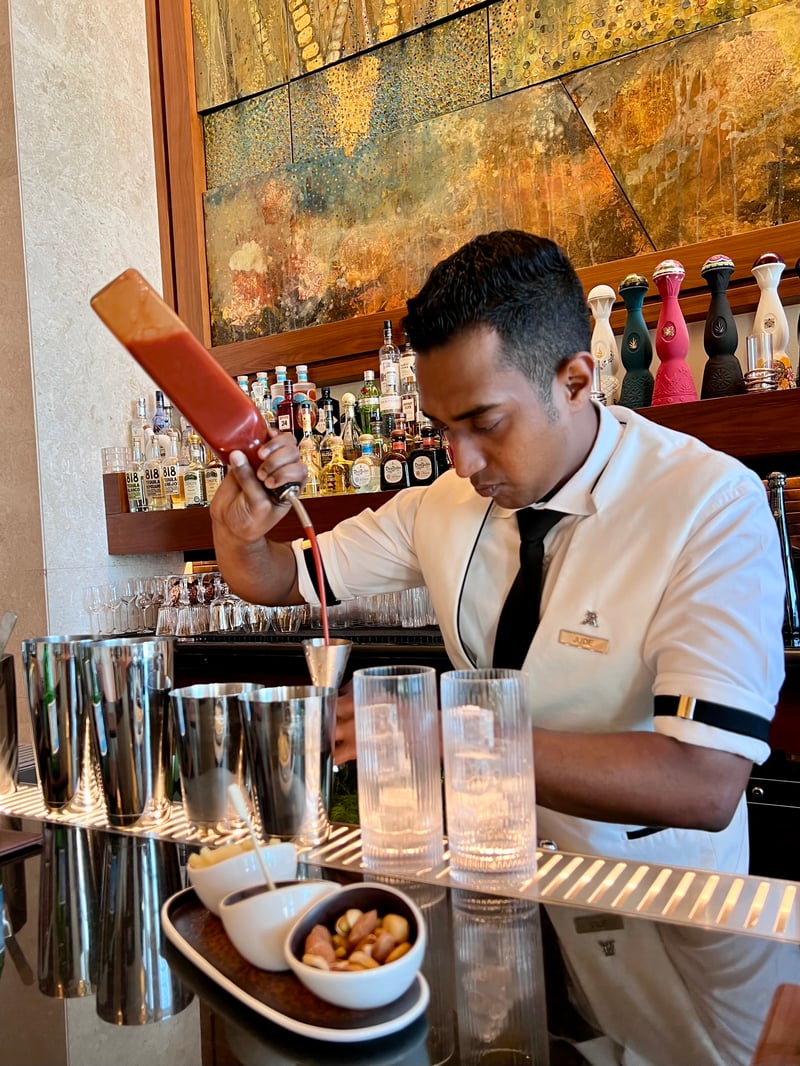 The Manhattan Lounge embodies the elegance and conviviality that define the brand. This refined bar, extended by a discreetly charming terrace, offers an ideal setting to enjoy early evenings in a cozy ambiance. The must-try: the Arabian Snapper, a local reinterpretation of the famous Bloody Mary created at The St. Regis New York in 1934. Enhanced with za'atar and cumin, this signature cocktail reveals bold flavors with Middle Eastern accents. We had the pleasure of watching it being prepared, guided by the bartender's fascinating explanations, before tasting it—a perfect introduction to our evening.