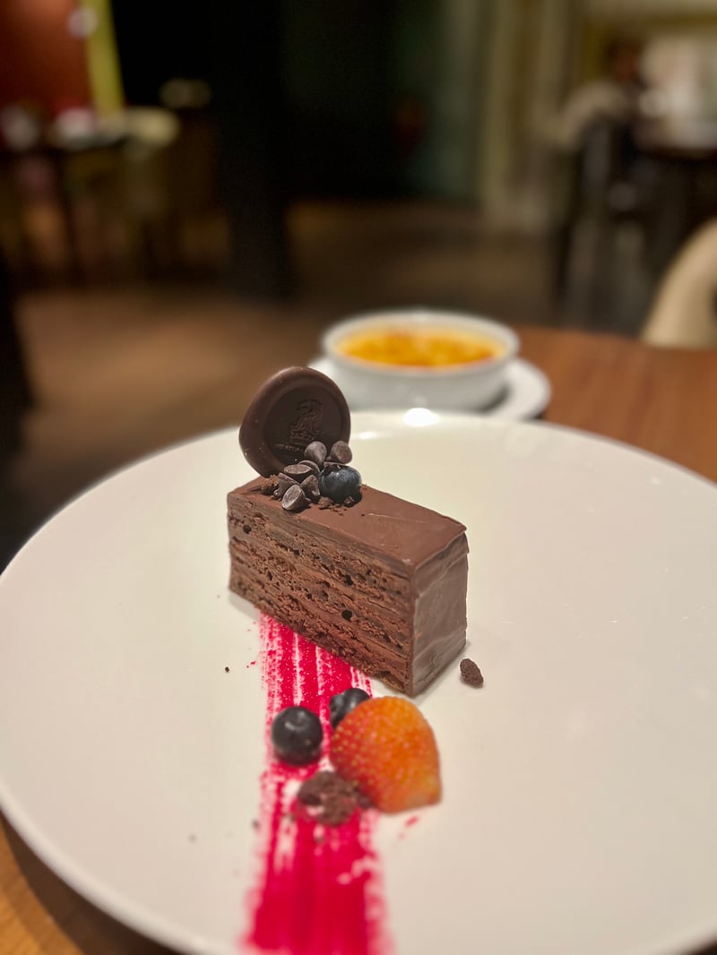 To conclude this feast, we gave in to two desserts. First, a vanilla crème brûlée, surprisingly made without baking, with a silky and delicate texture. Then, the Ritz-Carlton's signature cake, a rich and refined creation combining chocolate sponge cake, smooth ganache, orange peel, and a touch of Grand Marnier, for a finale that was both intense and elegant.