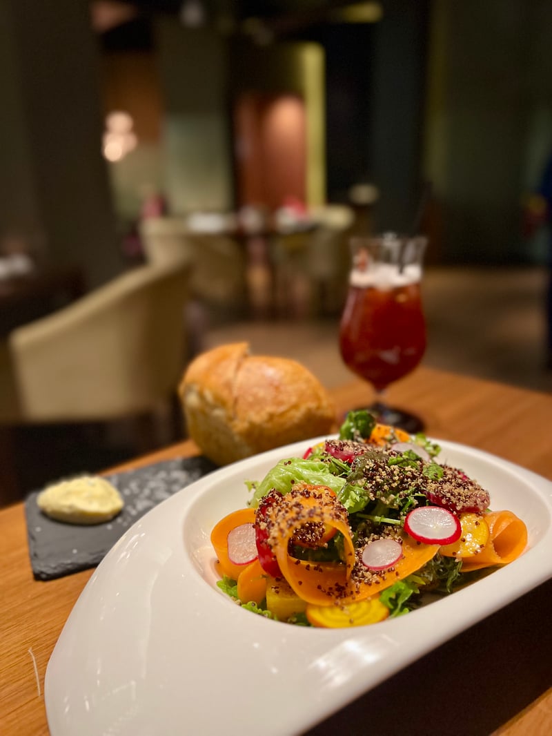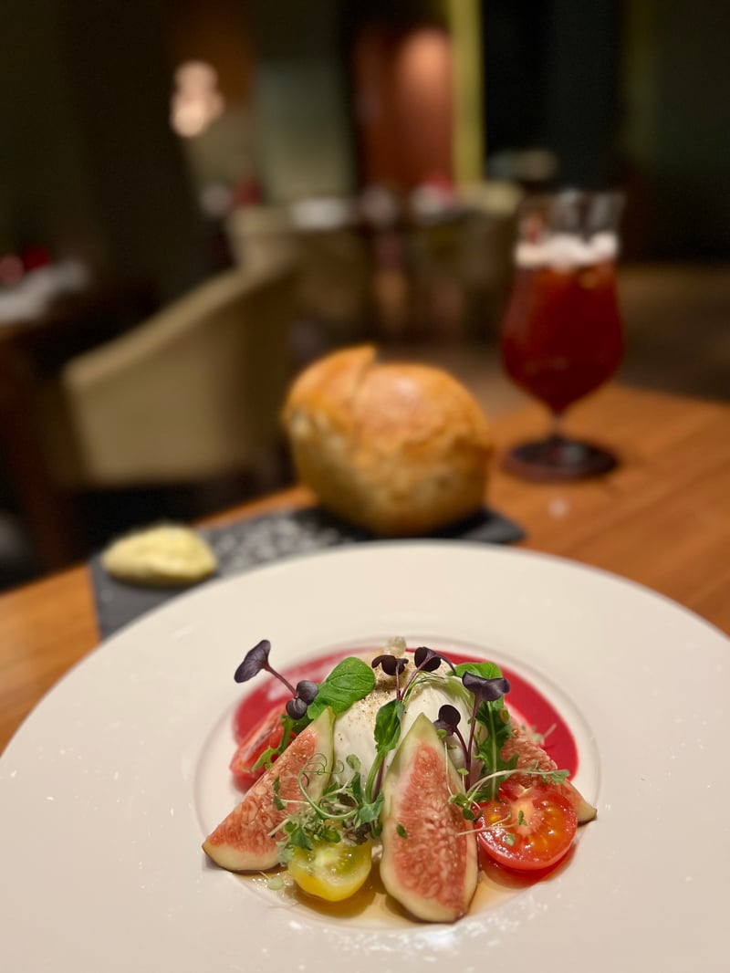 Our dinner at The Forge was a true gastronomic journey, marked by elegantly composed plates and perfectly mastered flavors. To start, we shared a creamy burrata, elevated by a blackberry sauce, fresh figs, and heirloom cherry tomatoes, all highlighted with basil leaves grown onsite in the restaurant's vertical farm. A starter that was fresh, creative, and delicately sweet and savory. We then tasted the Forge Salad, a beautiful balance of textures and colors: crunchy greens, carrots, beets, radishes, grilled pumpkin, and puffed quinoa, all enhanced by a fruity orange and mango vinaigrette. A vegetal interlude as aesthetic as it was flavorful.
