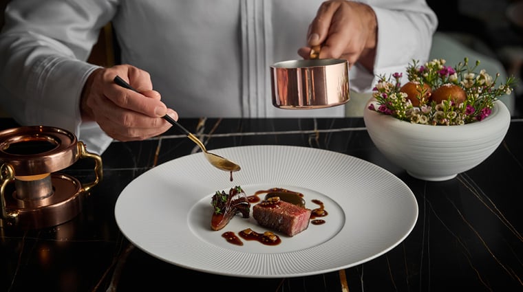 Yannick Alléno's two-Michelin-starred Dubai outpost occupies a vaulted, chandelier-hung dining room at One&Only The Palm, where chef Ilya Evdokimov executes the Parisian maestro's modern French repertoire. The six-course Experience Menu brings king crab with farmhouse cream, sturgeon nonette with Prunier caviar, and Wagyu mille-feuille, while the terrace overlooks landscaped gardens under lantern light—ideal for celebrations demanding technical precision and theatrical décor.