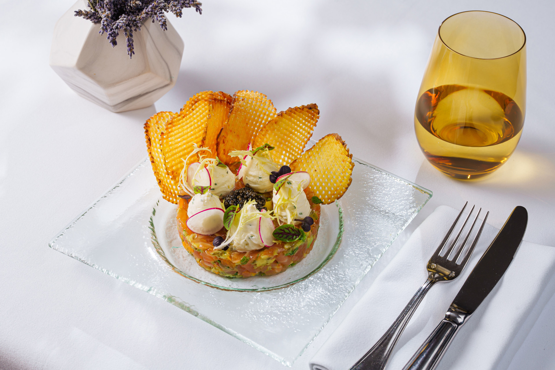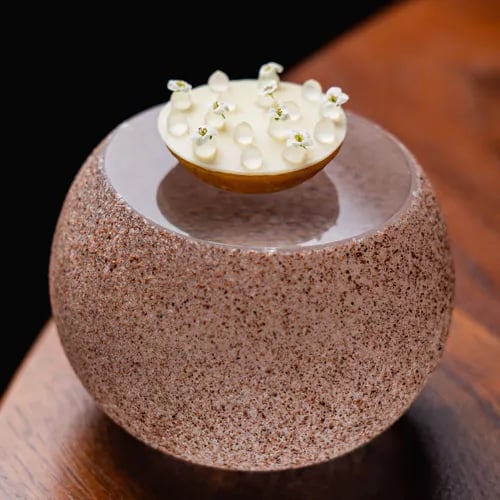 Heston Blumenthal's two Michelin-starred table at Atlantis The Royal brings historical British gastronomy to Dubai, with head chef Tom Allen executing dishes researched from 14th-century cookbooks. The signature meat fruit—chicken liver parfait encased in mandarin gel—requires days of preparation, while a towering mechanical pineapple clock inspired by Tudor royal kitchens powers the rotisserie for the celebrated tipsy cake. Sommeliers including Michelin Guide award-winner Arturo Scamardella guide pairings, and floor-to-ceiling windows frame the resort's Skyblaze fountain show.