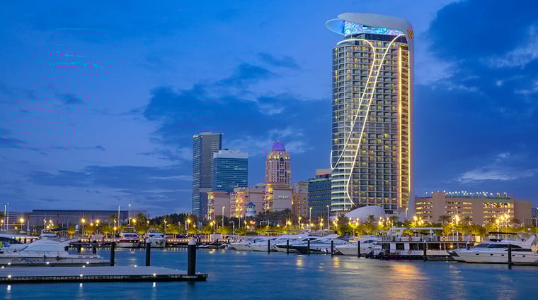 Giant neon pink tubes wrap the façade like oversized glow sticks, signaling the playful energy within. The pool deck channels Ibiza at its most exuberant, while upstairs, chef Akira Back's rooftop restaurant brings Korean-inflected flair to a South Beach-inspired setting. Families find welcome in a dedicated kids' club and rooms with sofa beds—proof that hedonism and hospitality coexist on The Palm.