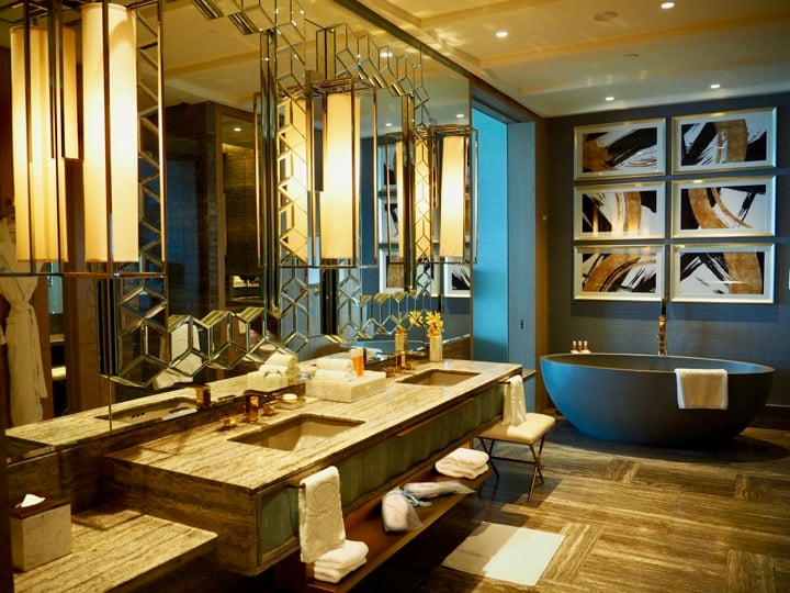 Inside, this five-star establishment mixes the best of both worlds, combining the glamour of Dubai with the laid-back atmosphere of a beach resort. As I stepped into the lobby, resembling an urban oasis with its shallow pools of water, I was immediately captivated by this elegant and contemporary space created by designer Jeffrey Wilkes. But I was swept off my feet by the two pathways lined with bronze tree sculptures, each covered with dazzling Bohemian-style lamps made of crystal. The pathways extend into the hotel garden with a series of real trees for an astonishing result.