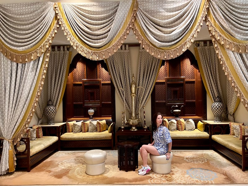We stayed in a 50m² Deluxe Room with a private balcony, a spacious dressing room, and a generously proportioned marble bathroom adorned with Diptyque brand toiletries. The interior atmosphere is dominated by chestnut woods, framing a discreet color palette of beige and mustard, and enhanced by typical Arabesque patterns of Dubai's old luxury hotels.