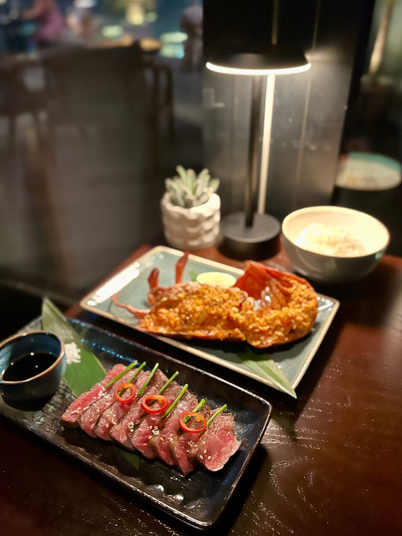 Then came the mains. The Wagyu ribeye first, thinly sliced and seared to perfection, revealing a tender texture and remarkable aromatic intensity. Sprinkled with red chili, grilled sesame seeds, and coated in a caramelized sweet soy sauce, it was elevated by a few chive sprigs adding a fresh herbal note. In contrast, the lobster captivated with its enchanting aromas and generosity: perfectly cooked lobster topped with yuzu kosho butter blending the zest of Japanese citrus and a hint of spice, sprinkled with chili crumble for crunch, and finished with a dash of lime juice. A spectacular surf-and-turf duo, which we paired with simple white rice topped with grilled sesame seeds to highlight every flavor.