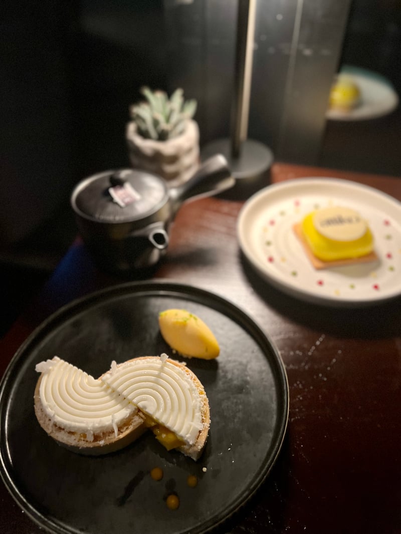 To end this culinary journey, time for sweets. The yuzu cheesecake first, combining the tangy freshness of yuzu with the creamy softness of a light mousse. Its crunchy Lotus biscuit base brought a caramelized, lightly spiced note, contrasting with the mousse's lightness and its bright yellow glaze. Topped with a disc stamped with “attiko,” it brilliantly concluded the meal. Finally, the mango and coconut tart brought a sunny tropical touch: a thin crunchy shortbread base filled with a soft mango heart, topped with a perfect spiral of coconut cream, and served with intensely fragrant mango sorbet — a bright, sweet, and refreshing bite, ending on an exotic and refined note.
