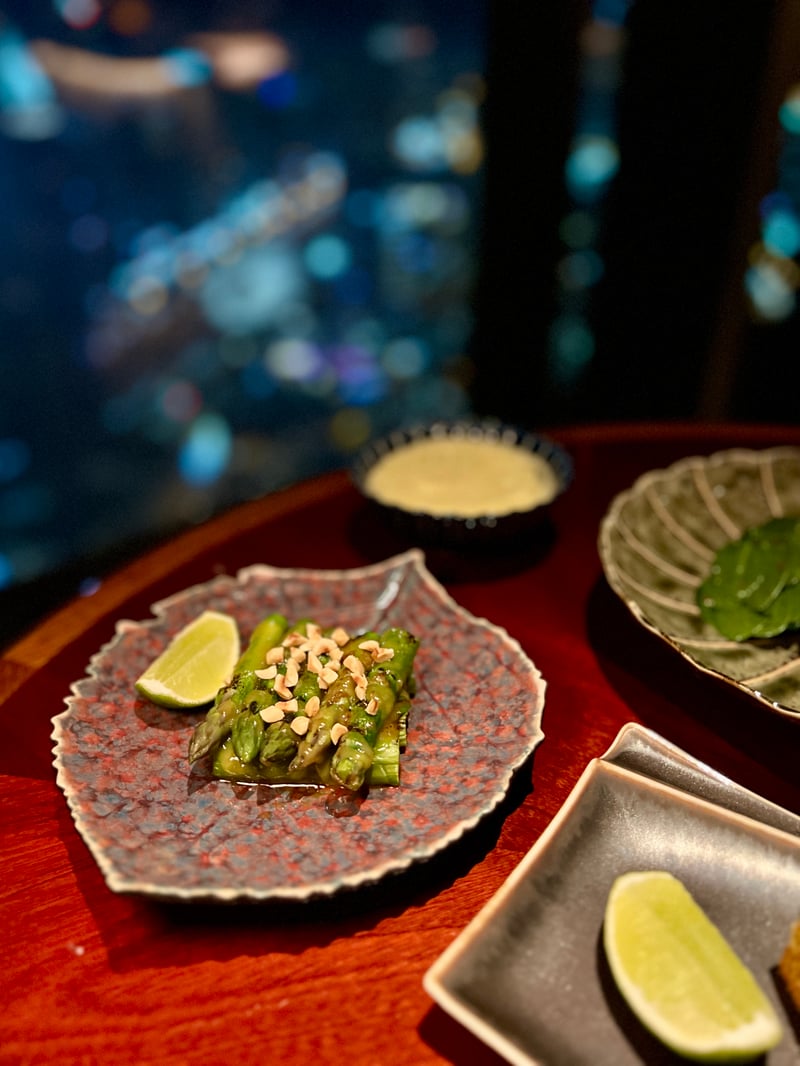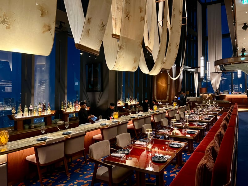 Behind Its Double Doors, Bar des Prés Dubai Reveals a Sophisticated World Designed by Renowned Designer Lázaro Rosa-Violán, Staying True to the DNA of Its Paris and London Counterparts. Situated on the 51st Floor, the Venue Impresses Immediately with Spectacular Views of the City, From the Jumeirah Mosque to the Emirates Towers. The Interior, Both Chic and Vibrant, Elegantly Blends Asian and Western Influences: the House's Signature Blue Mixes with Copper Highlights, While Natural Materials Like Bamboo, Rattan, and Silk Evoke the Delicacy of Asia. Italian Marble Tables, Peacock-Patterned Embroidered Fabrics, and Subtle Lighting Reinforce the Intimate and Refined Ambience. The Sushi Counter, Dressed with a Stunning Raw Silk Installation, Welcomes up to Ten Guests in an Intimate Setting That Pays Homage to Japanese Craftsmanship. Every Decorative Element, From Comfortable Seating to Artistic Pieces, Has Been Carefully Selected to Offer an Immersive Sensory Experience, Where Design Naturally Extends the Culinary Identity of the Space.