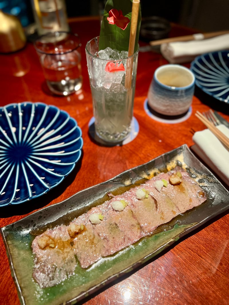 To Start, a Selection of Six Exquisitely Crafted Sushi Set the Tone for the Evening. Presented on an Elegant Wooden Tray, Each Nigiri Glowed With a Silky Shine, Showcasing the Freshness and Exceptional Quality of the Fish. From Salmon to Bluefin Tuna, Shrimp to Hamachi, Every Piece Reflected Japanese Precision and Attention to Detail, Both in the Cutting and the Balance of the Rice. We Then Continued With a Sublime Half-Seared Australian Wagyu Carpaccio, Delicately Flamed to Perfection and Served on a Ceramic Plate in Green and Brown Tones, Highlighting the Rosy Hues of the Meat. The Melt-in-the-Mouth Texture of the Wagyu, Enhanced by a Subtly Flavored Truffle Ponzu, Was Accented by Grated Daikon and Golden Crisps, Adding Both Freshness and Contrast.