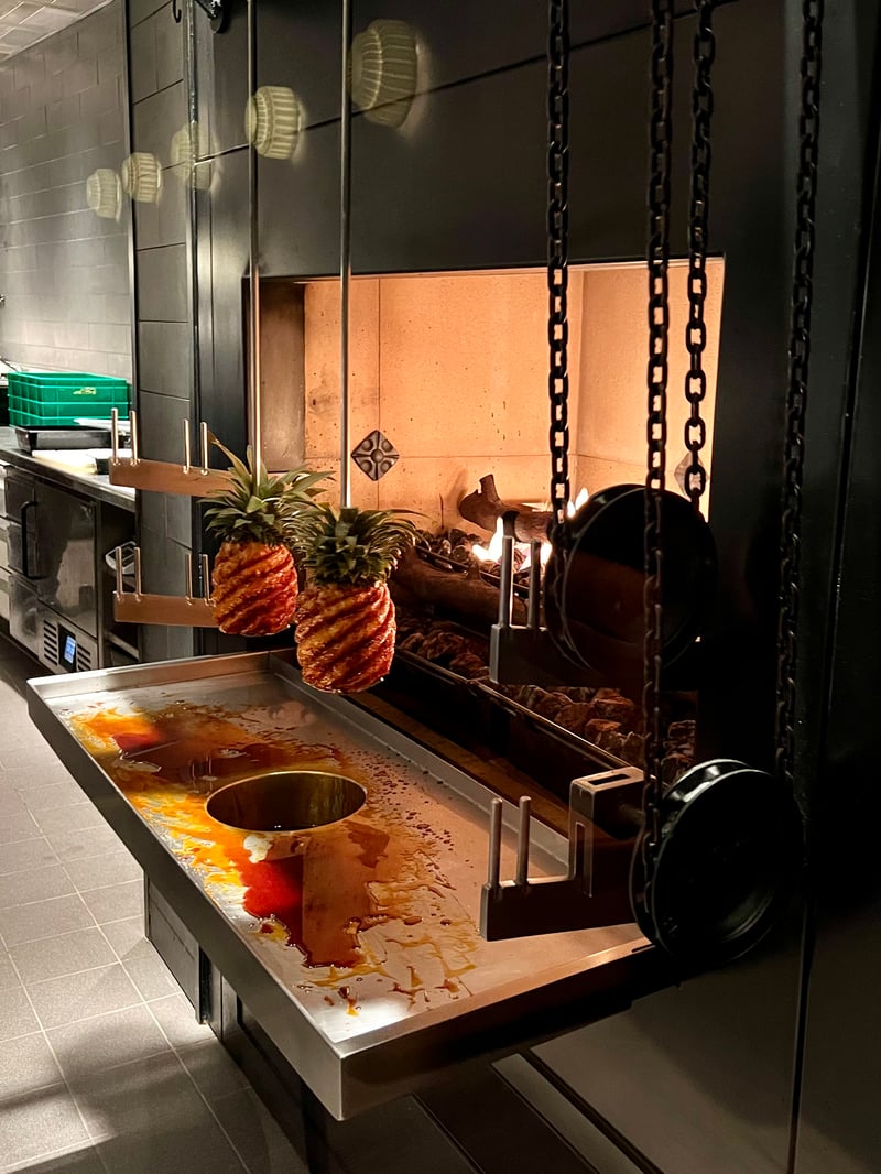 The most spectacular element of the decor is undoubtedly the impressive mechanical pineapple-shaped clock located in the center of the room, which comes to life every half-hour to rotate the roasted pineapples cooking on the spit in the kitchen. This feature gives the restaurant an atmosphere of decadence and eccentricity that is uniquely Heston Blumenthal.