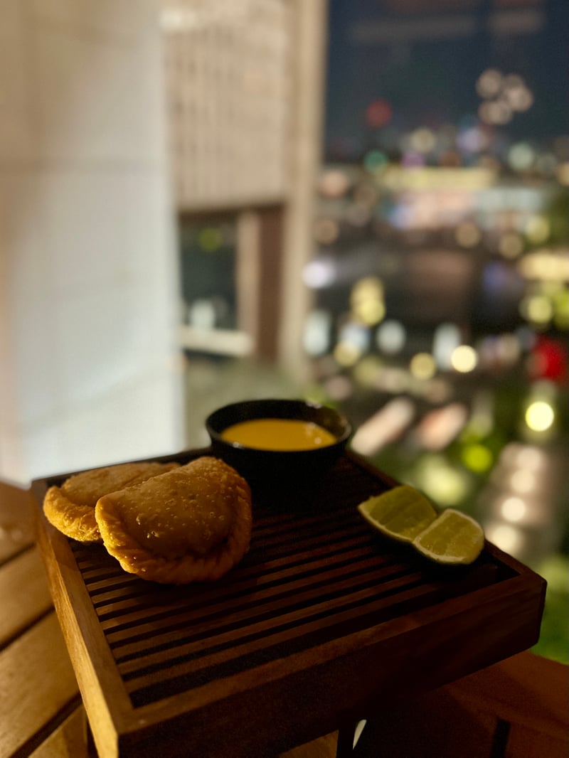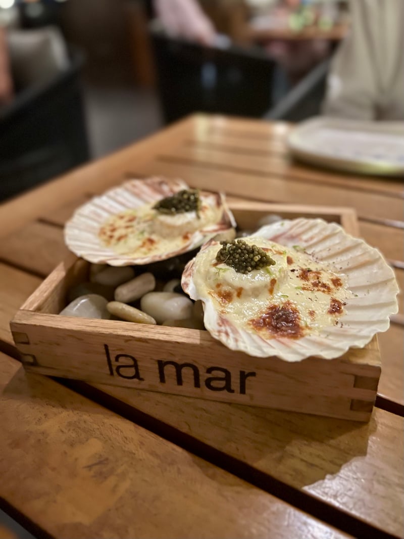 We continued with the Empanadas de Carne—crispy on the outside and generously filled with MB7 wagyu beef sautéed in the lomo saltado style. They were served with a rocoto chili sauce that was creamy and spicy, and lime wedges to add a welcome touch of freshness. Then came the Conchitas La Mar, served in their pearly shells on a bed of pebbles—elegance in every detail. The scallops, topped with an aged parmesan foam, were elevated with grilled leche de tigre butter, crispy garlic, and a hint of caviar, creating a burst of marine flavors.