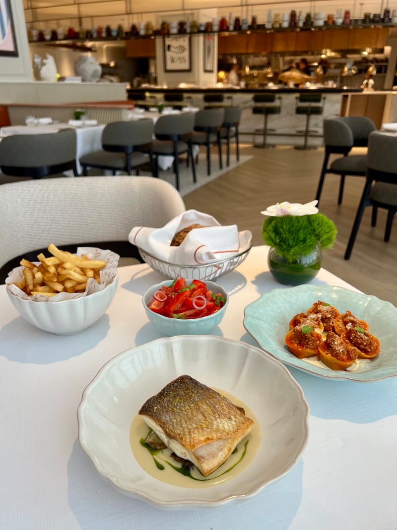 Next came the main courses, where Tuscany expressed itself with strength. The Tortelli Versilia, true jewels of fresh pasta, revealed a filling of beef and Swiss chard, topped with a creamy parmesan sauce. Crowned with a rich, fragrant ragù, sprinkled with Parmigiano and mint, they evoked the warmth of family kitchens while carrying Vera's elegant signature. In contrast, the Branzino illustrated the purity of the sea. Its fillet, with crispy skin and pearly flesh, rested on a bed of tender artichokes. Lemon sauce brought freshness and brightness, enhancing the fish's finesse. Around it, a salad of datterini tomatoes, vivid red and heightened with onions and herbs, celebrated the Italian summer in all its vibrancy. Hand-cut, perfectly golden patate fritte completed the set with a comforting, convivial touch. The table then transformed into a complete tableau: sea, land, and popular tradition conversed in harmony, perfectly reflecting the spirit of Versilia.