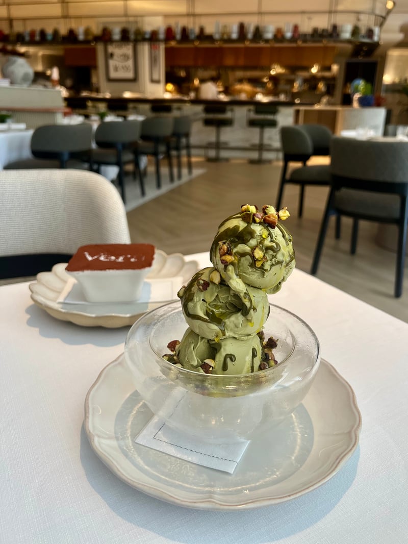 Finally, the meal ended on a sweet and memorable note. The house's signature Tiramisù appeared like a cocoa-dusted jewel box. On its brown surface, the name Vera was drawn in contrast, like a delicate seal. Beneath this veil, the perfect alternation of airy mascarpone, soaked biscuits, and coffee revealed itself, offering each spoonful a blend of intensity and sweetness. Beside it, the Gelato Mantecato al Pistacchio rose as a gourmet sculpture of three scoops, tender green, sprinkled with caramelized pistachios. Creamy and crunchy, sweet and fragrant, it paid tribute to Sicily and the art of gelato at its finest, especially when drizzled with a few drops of olive oil. These two desserts—one rooted in tradition, the other celebrating Italian raw ingredients—concluded the journey with elegance and indulgence.