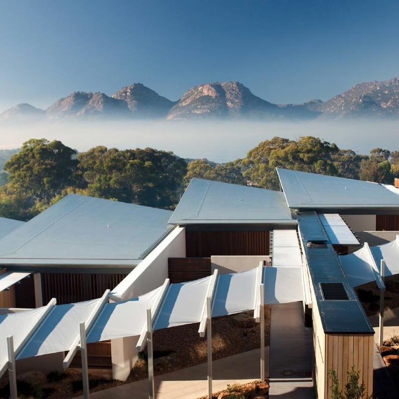 Rising from Tasmania's coastal bushland with a distinctive stingray-shaped roof, Saffire Freycinet claims the sole address within Freycinet National Park. Twenty suites lined in local oak and celery-top pine frame the pink granite Hazards and secluded Oyster Bay coves. The all-inclusive program pairs guided wilderness walks and an on-site Tasmanian devil sanctuary with free-flowing wine from dedicated cellars, pool, and spa.