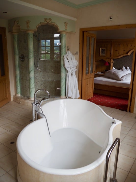 I had the pleasure of staying in the establishment's top suite: the master suite, called the “Kirchdachl.” Spread over 94 m², the suite has two bedrooms, a spacious bathroom with a central heart-shaped bathtub, a rustic seating area, and a balcony overlooking the mountains. Here you won't find the modernity of some of the hotels I've visited in the past; rather, the emphasis is on a perfect coexistence of tradition and comfort.