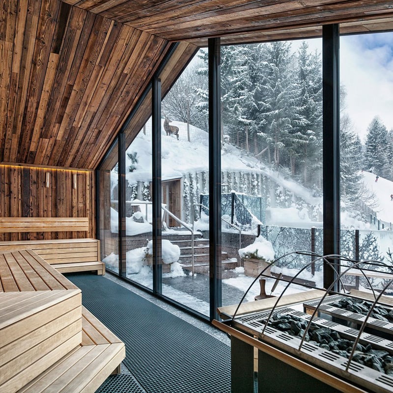 With a mountain gondola station at its doorstep and a ski-slope snack shack serving spit-roasted chicken, mama thresl channels urban energy into Alpine terrain. Maximalist knotted pine interiors include an "empty room" with a suspended vintage stove for panoramic meditation. The Finnish sauna ranks among Leogang's finest; upgraded suites add private hot tubs and rooftop terraces facing the Pinzgauer peaks. One private dining table requires indoor rock climbing to reach.