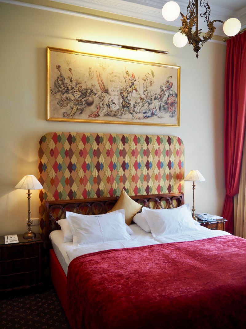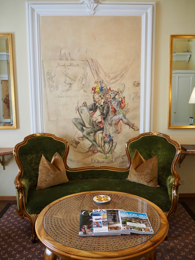 Next stop, the suite where I'll spend the night. It's the perfect combination of antique style and modern comfort, featuring a classic elegance with a theatrical quality, an emphasis on music or visual arts… Salzburg's reputation as “the City of Mozart” sets the theme. The room is filled with elegant materials, such as the heavy curtains and the opulent antique furniture.