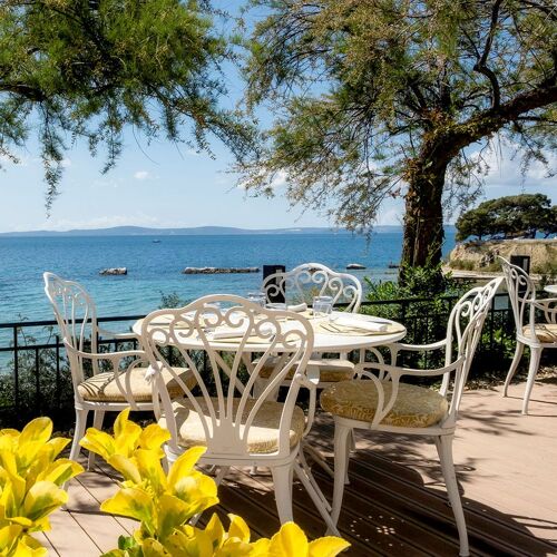 Just beyond Split's historic core, Dvor commands a shoreline position where a leafy garden terrace meets the Adriatic. The family-run kitchen centers on a wood-fired grill, turning the day's catch—displayed fresh at the entrance for diners to select—into straightforward Mediterranean plates. A carefully assembled wine list and unhurried service complete an afternoon or evening defined by coastal simplicity rather than ceremony.