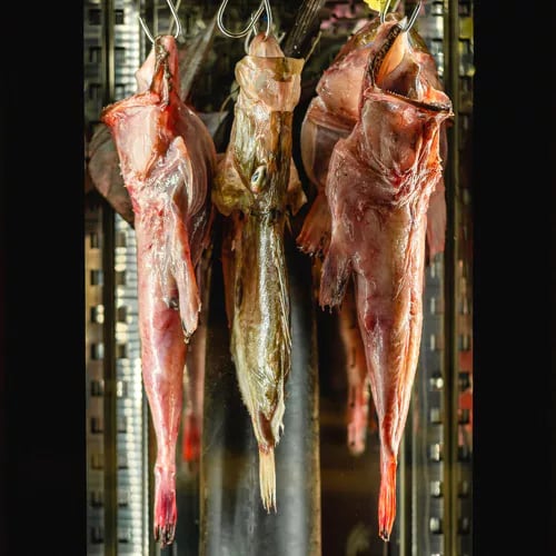 An L-shaped counter wraps around an open kitchen where chefs present each course personally, explaining its origins and inspiration. The Michelin-starred menu draws almost exclusively from the Adriatic and Croatian hinterland, with bread, butter, and fermented preparations all made on-site. Fish and meat age in glass-fronted refrigerators visible from every seat—a transparency that defines both philosophy and flavor.