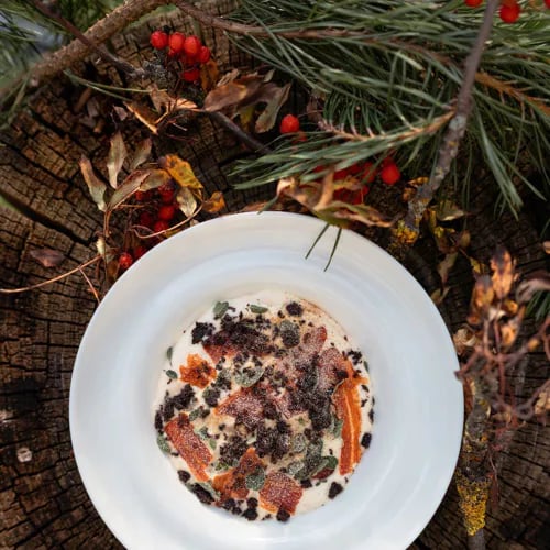 Behind a modest Brno façade, an excavated medieval church wall—preserved behind glass—anchors a dining room of understated elegance. The farm-to-table kitchen channels Mediterranean warmth through shrimp confit with saffron aioli and herb-scattered gnocchi with goat cheese. An extensive European wine list complements both à la carte selections and composed tasting menus, served with polished, unhurried attention.