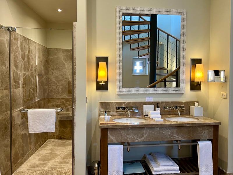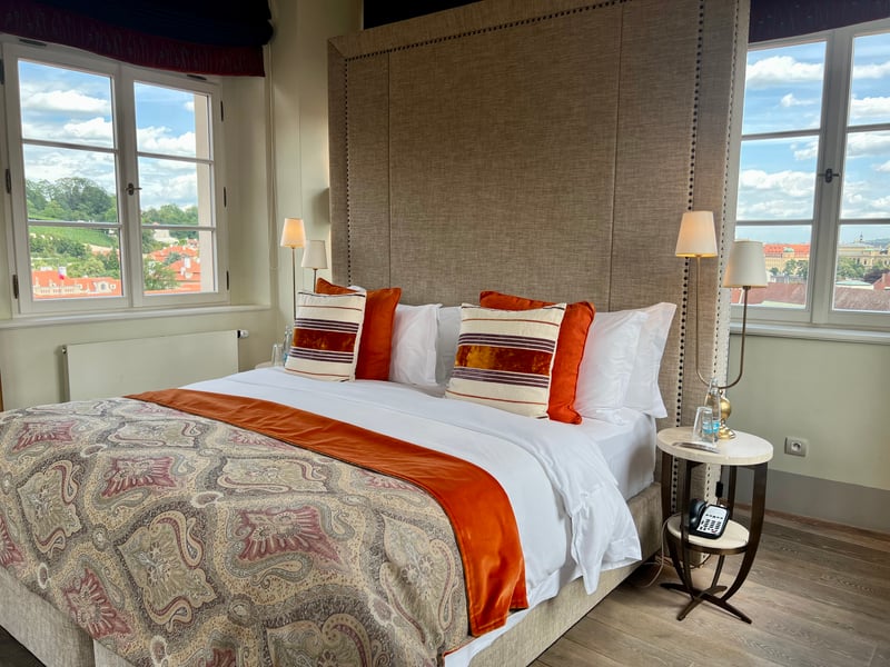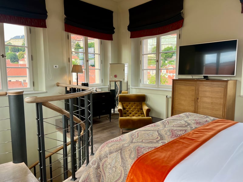 Among these jewels, the Tower Suite, where we had the privilege of staying, holds a place of distinction. Nestled in the monastery's former astrological tower, it stands out as one of Augustine's most spectacular accommodations — and without doubt among the most remarkable suites in the entire city. Spread over three floors connected by a spiral staircase, it offers an unparalleled 360° panorama of Prague. The first floor features an intimate living room; the second houses a vast marble bathroom, a true sanctuary of relaxation; and the top level, dedicated to the bedroom, seems suspended above Malá Strana's rooftops. Staying in the Tower Suite means living a rare experience, where every view embraces Prague's history and timeless beauty.