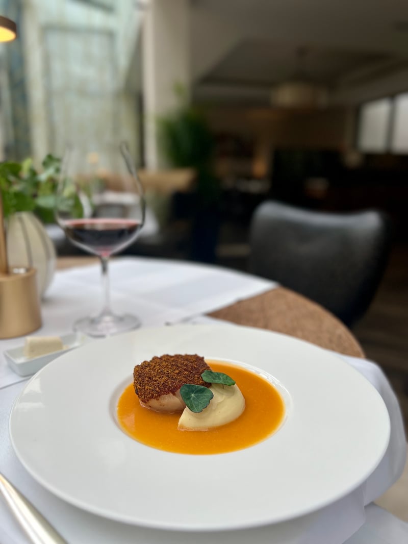 Our dinner at the Augustine Restaurant was a true celebration of flavors, elevated by an elegant, hushed setting where the history of the place intertwined with the contemporary creativity of Chef Jan Horák. For starters, my husband chose roasted daikon, accompanied by a silky parsley root purée, brightened with a touch of sour cream and enhanced with a delicately flavored tomato-olive sauce. For my part, I opted for a scallop carpaccio of exquisite freshness, served with salt-crusted kohlrabi, thin slices of beef speck, a hint of bottarga, and a pea sauce that added a lovely liveliness to the dish.