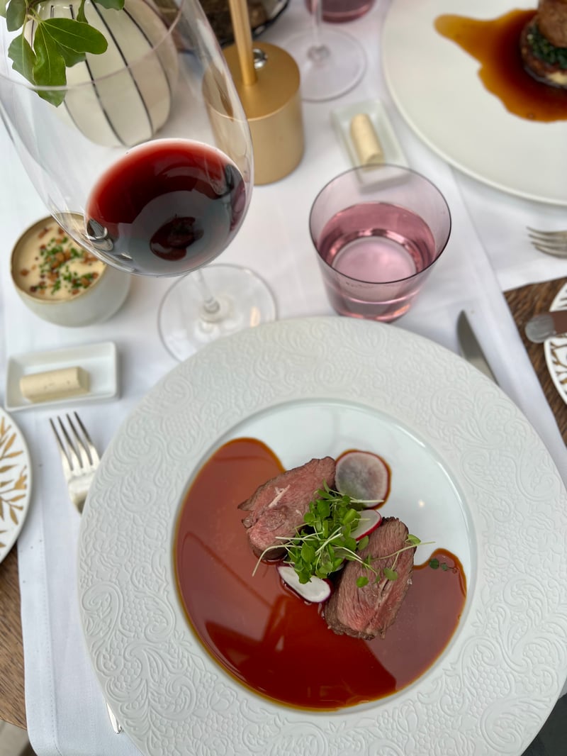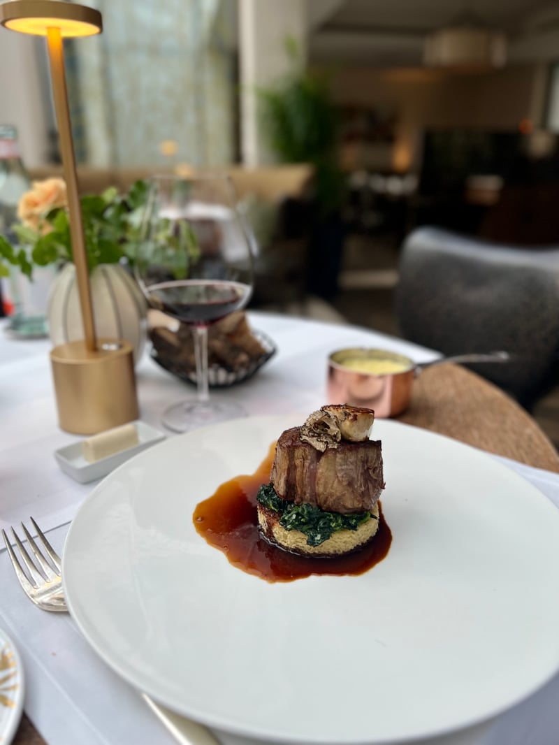 For the main course, my husband indulged in a beef fillet Rossini, served over mashed potatoes, accompanied by creamy spinach, topped with seared foie gras, and perfumed with fresh truffle — a marriage of textures and flavors worthy of the finest tables. As for me, I savored a superb farmhouse lamb leg “Maso z lúky”, delicately grilled, resting on a watercress purée, paired with baked potato mousse infused with bone marrow, all draped in a lamb sauce of remarkable aromatic depth.