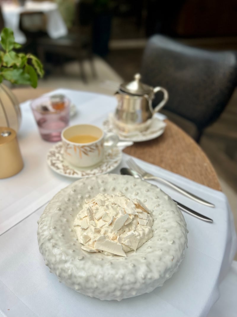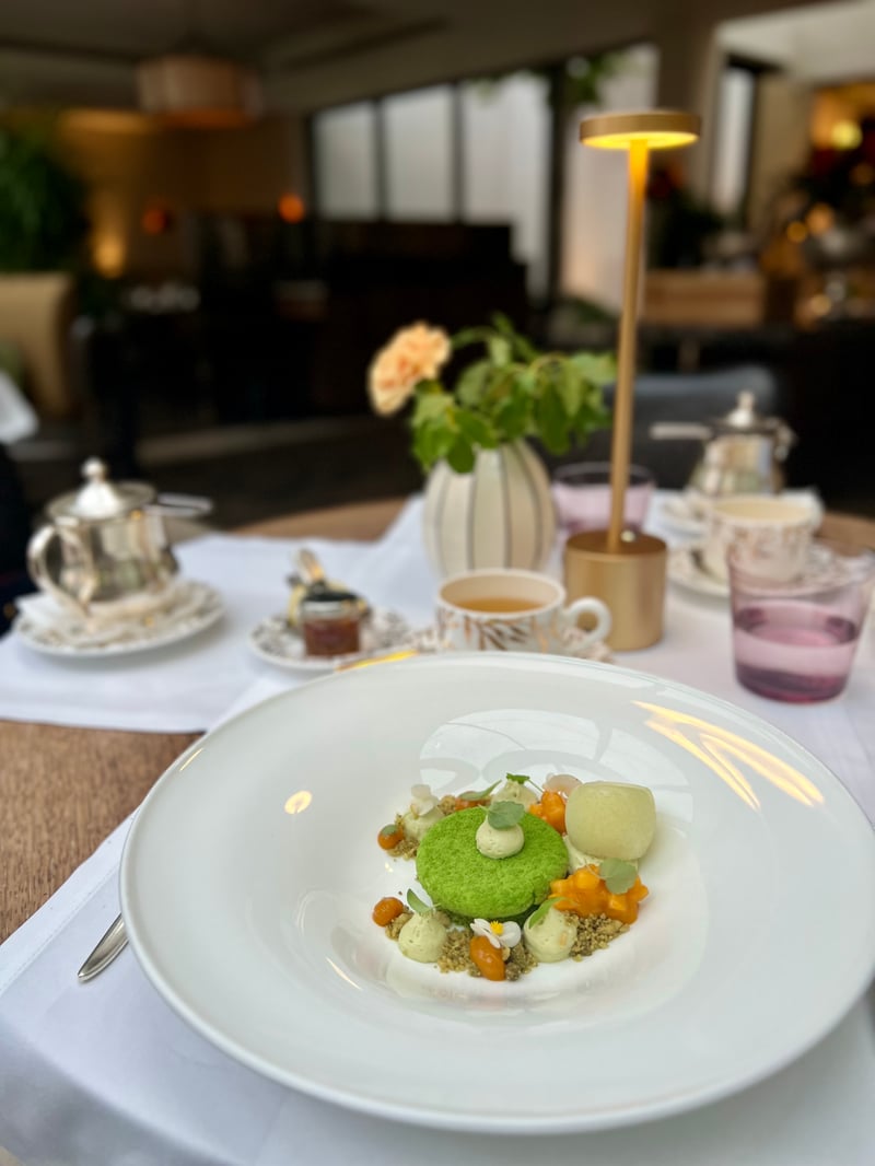 The meal ended on a sweet note, as refined as it was original. My husband enjoyed tapioca pudding with coconut milk, accompanied by poached rhubarb, hibiscus jelly, and wild strawberry sorbet — a blend of sweetness and freshness. As for me, I succumbed to the lightness of a matcha tea mousse, served with spinach sponge cake, spicy mango salsa, and cucumber–elderflower sorbet — a bold, balanced, and wonderfully refreshing dessert.