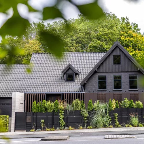 A 1911 villa in Risskov houses one of Aarhus's most refined dining rooms, where a glass-walled kitchen puts the culinary theater on full display. The one-starred kitchen draws from its own mini farm to craft dishes of precise complexity—grilled scallop with dashi and radish, wood pigeon paired with blackberry and pickled beetroot—balancing Nordic tradition with international technique in every meticulously composed plate.