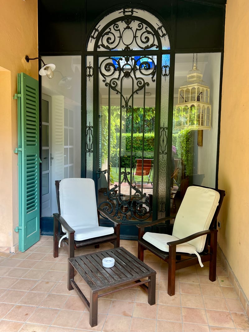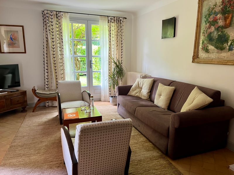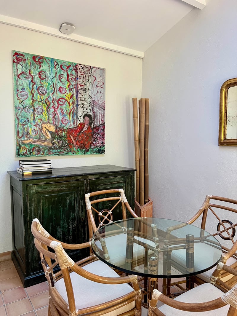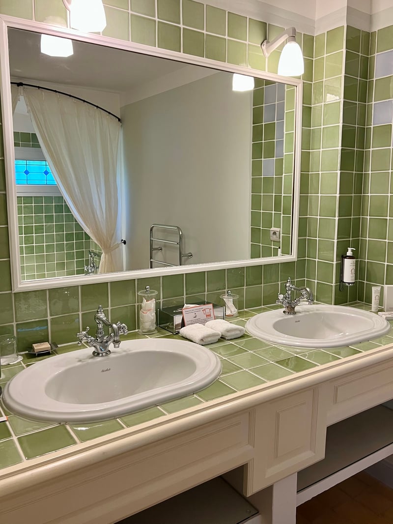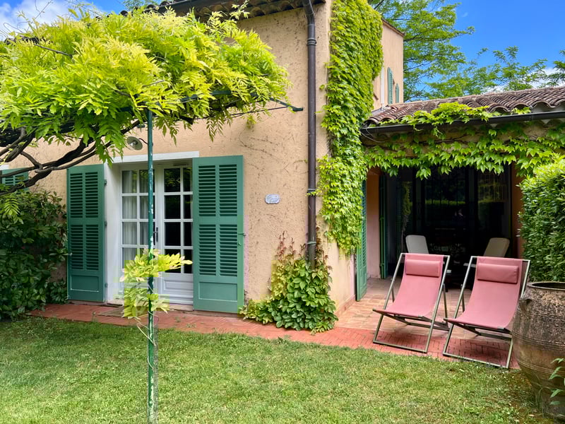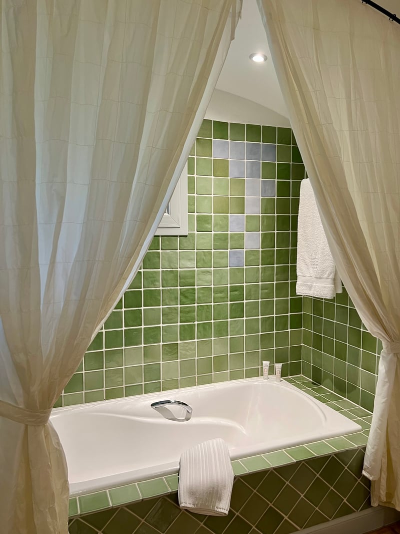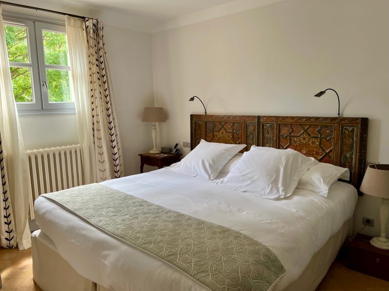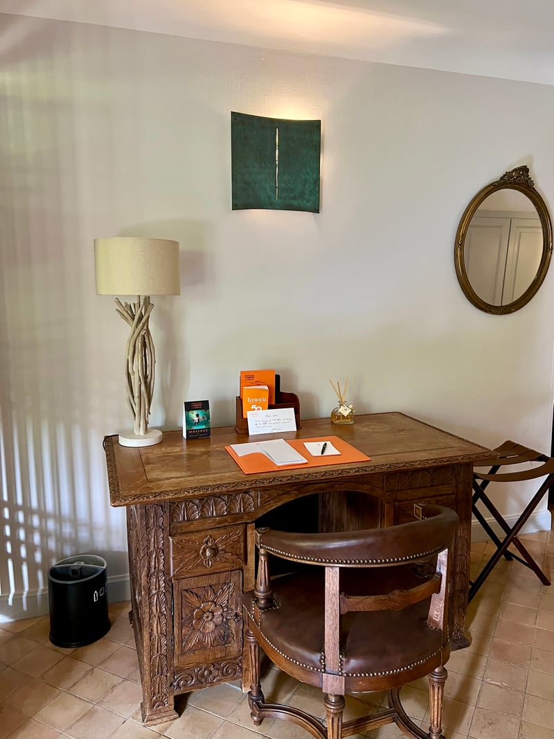 We stayed in the Perpétue de la Celle suite, a refined cocoon nestled in the Béguinage, at the heart of a private garden hidden from view, shaded by wisteria. This suite stands out for its generous space and travel-inspired decor: the living room on the ground floor invites daydreaming with its dark woodwork and green tones evoking Asia, while the mezzanine bedroom features a headboard painted with delicate arabesques and oriental accents. Outside, a winter garden and a furnished terrace extend this serene atmosphere facing the Roc du Candelon. A bright bathroom with a bathtub completes this enchanting scene, perfect for savoring a peaceful stay in an elegant and intimate country house.