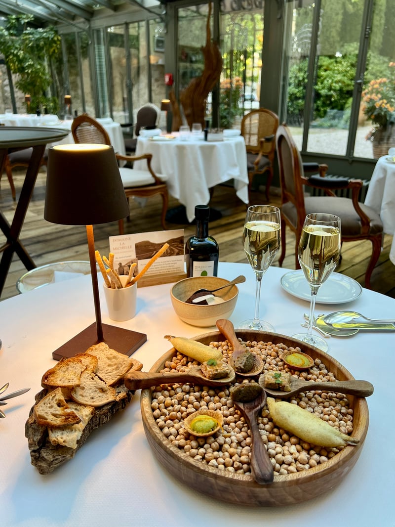 We chose to compose our dinner à la carte, although the seasonal menus – Spring or Sharing Moment – had both piqued our curiosity. At our beautiful table set in the light-filled veranda, the meal began with a series of refined amuse-bouches. Presented in a bowl filled with dried chickpeas, on lovely wooden spoons, they displayed a rustic yet elegant aesthetic. Each element played with the textures and flavors of Provence, perfectly matched with our glass of champagne. An introduction as generous as it was subtle, true to the chef's cuisine.