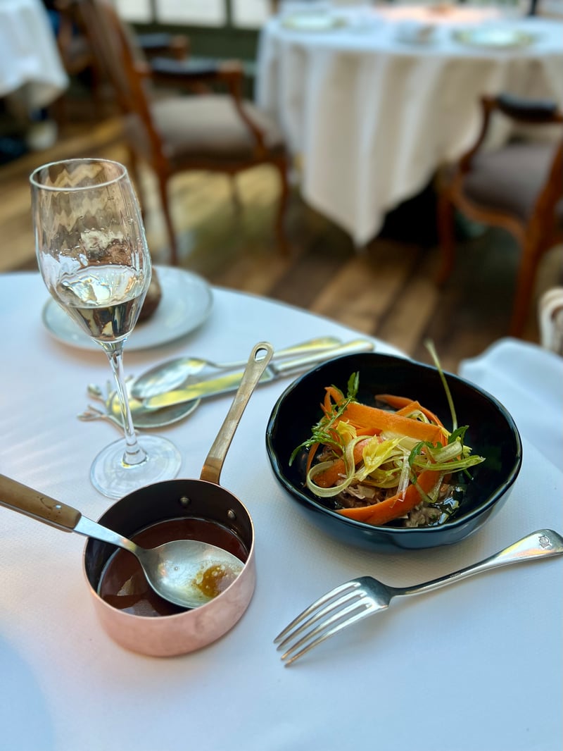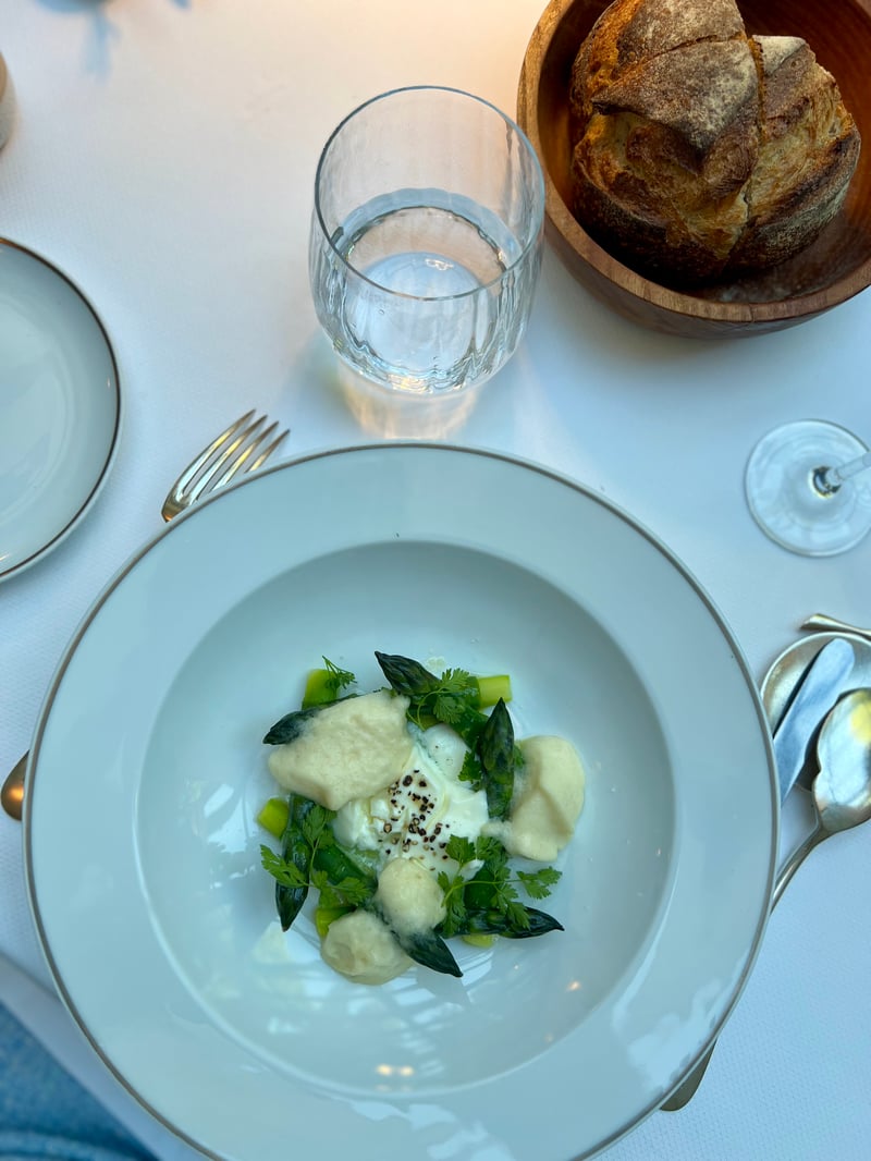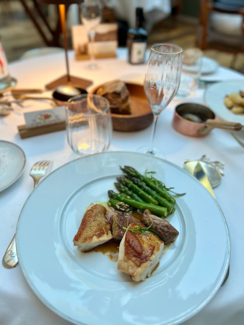 For starters, my husband chose rabbit rillette with rosemary – tender and fragrant – accompanied by crunchy spring vegetables, enhanced by a jus served separately in a small copper saucepan. A dish full of contrast, between tenderness and freshness. As for me, I opted for green asparagus from Provence paired with creamy ewe's milk cheese. Accented with a few fresh herbs, this plant-based dish expressed all the balance and lightness of a springtime plate.