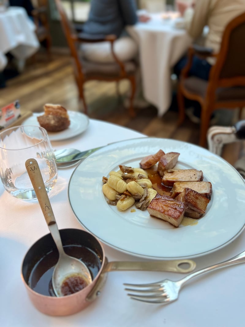 For the main course, my husband continued with pork from Manon's farm, served as a chop and rib. Perfectly browned, its juicy meat was accompanied by tender homemade gnocchi and sautéed mushrooms, all enhanced by a rich jus. A heartwarming plate rooted in regional tradition. I enjoyed poultry from Galinettes, cooked to perfection, served with green asparagus and a tender morel, elevated by an arugula condiment. A delicate dish, vibrant with freshness and precision.