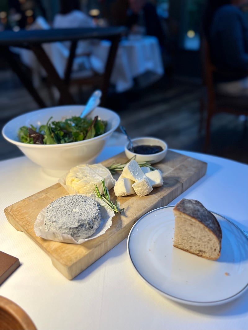 We then shared a platter of fresh and aged cheeses, accompanied by a local herb mesclun. Ash-covered goat cheese, creamy soft cheese, firmer tomme, and flavorful compote made up an interlude full of authenticity, in a simple and generous spirit.