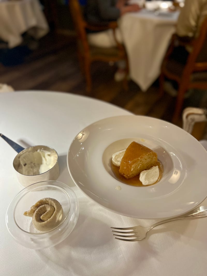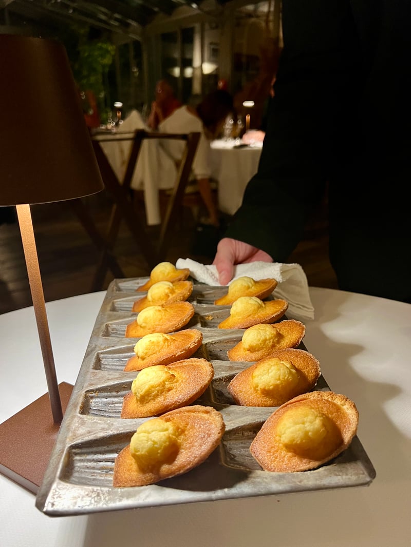 On the sweet side, my husband was tempted by the house's grand classic: the savarin. Presented whole at the table on a silver tray before being carefully sliced in front of us, it was soaked to his preference (he chose rum), accompanied by lightly whipped vanilla cream and a fragrant condiment. A dessert both spectacular and comforting. I chose a fruitier plate, highlighting strawberries from Provence paired with poached rhubarb. This dessert celebrates the sunny days with simplicity and freshness: the juicy, fragrant strawberries are combined with delicately tangy poached rhubarb. Carefully plated, they are accompanied by an intense coulis that enhances the fruit's flavors, for a dish as light as it is indulgent. Finally, to conclude this beautiful moment, we savored the house's famous madeleines, served still warm. Golden, soft, and beautifully domed in the center, they perfectly embodied the elegance of a simple gesture, for one last tender bite.
