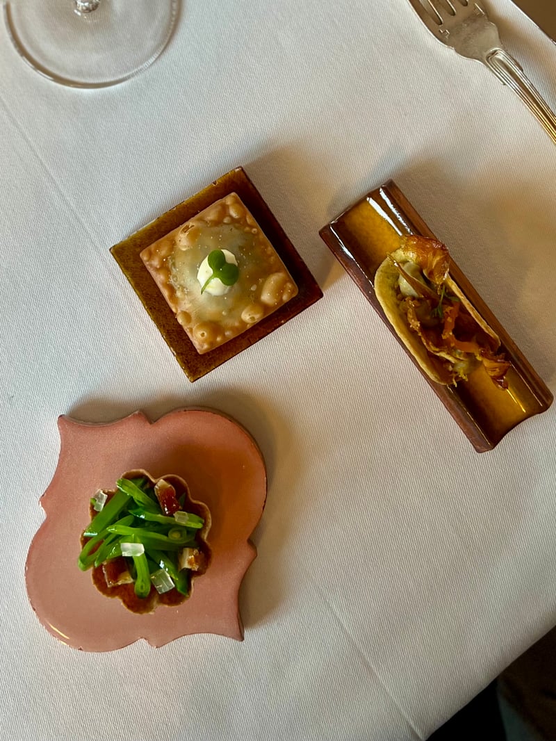 Our dinner was a true gastronomic journey, an immersion into the heart of Provence's flavours, where each dish told a story, that of a terroir sublimated by tradition and inventiveness. It all began with a succession of appetisers that honoured local products with elegance and subtlety. We discovered a revisited socca, fine and crispy, topped with anchovies and enhanced with a touch of black olive: a refined nod to southern traditions. Alongside it, a light and fragrant vegetable broth gently awakened the palate, while other delicate bites, built around local produce, extended this first gourmet moment. This delicate prelude was accompanied by a glass of champagne, bringing a sparkling and festive note.