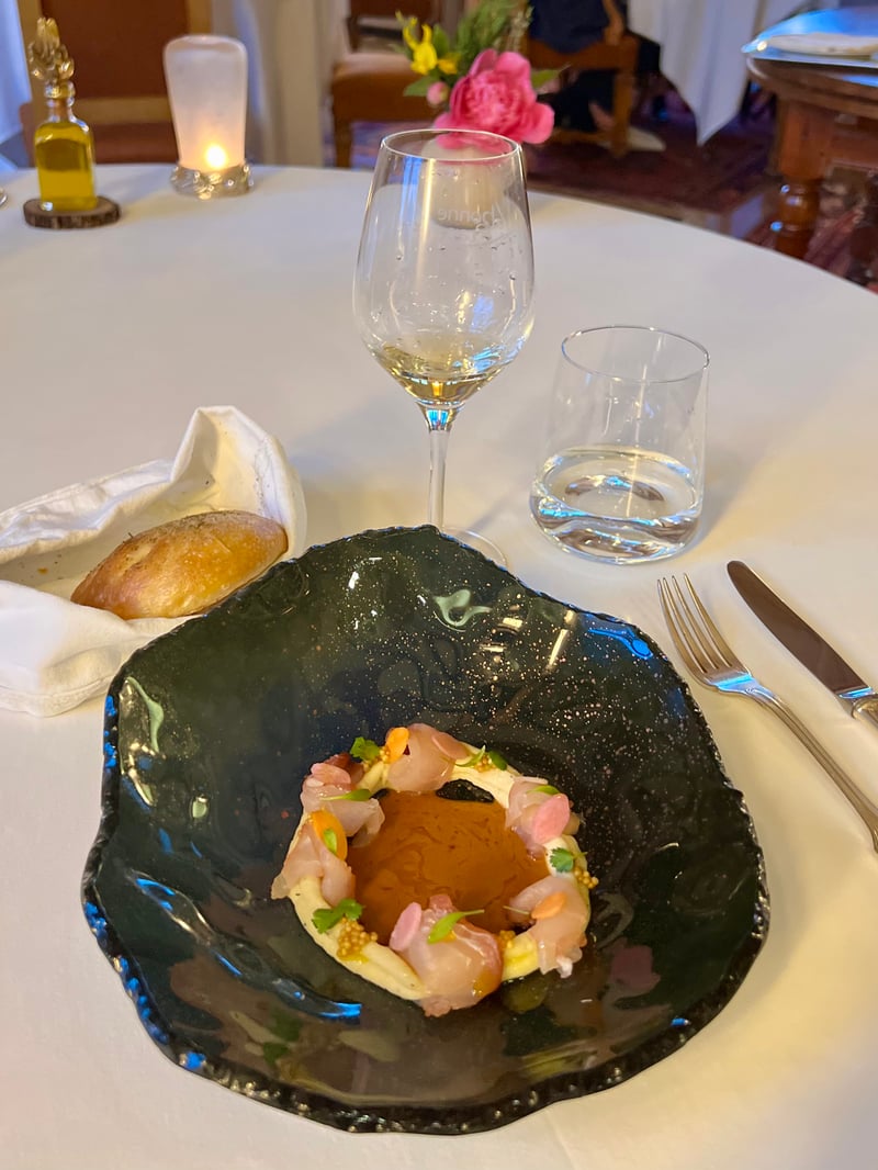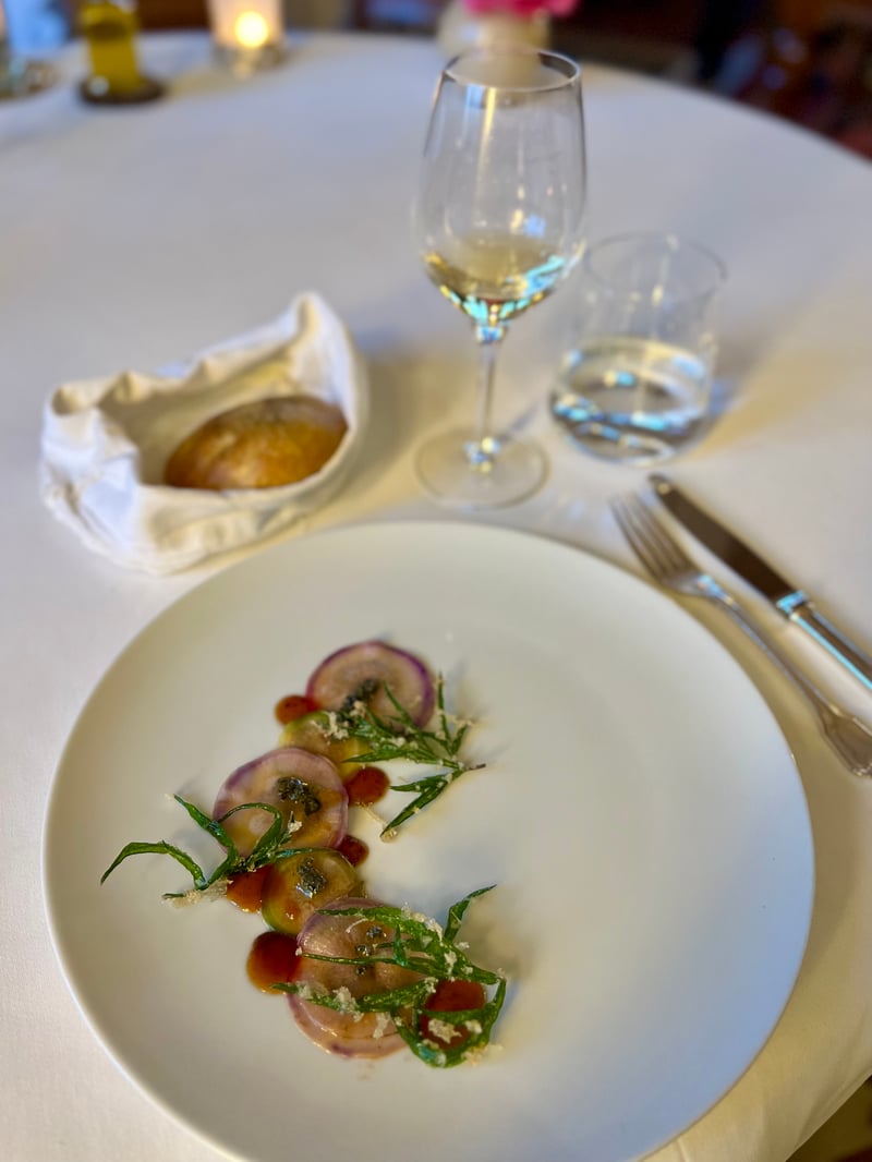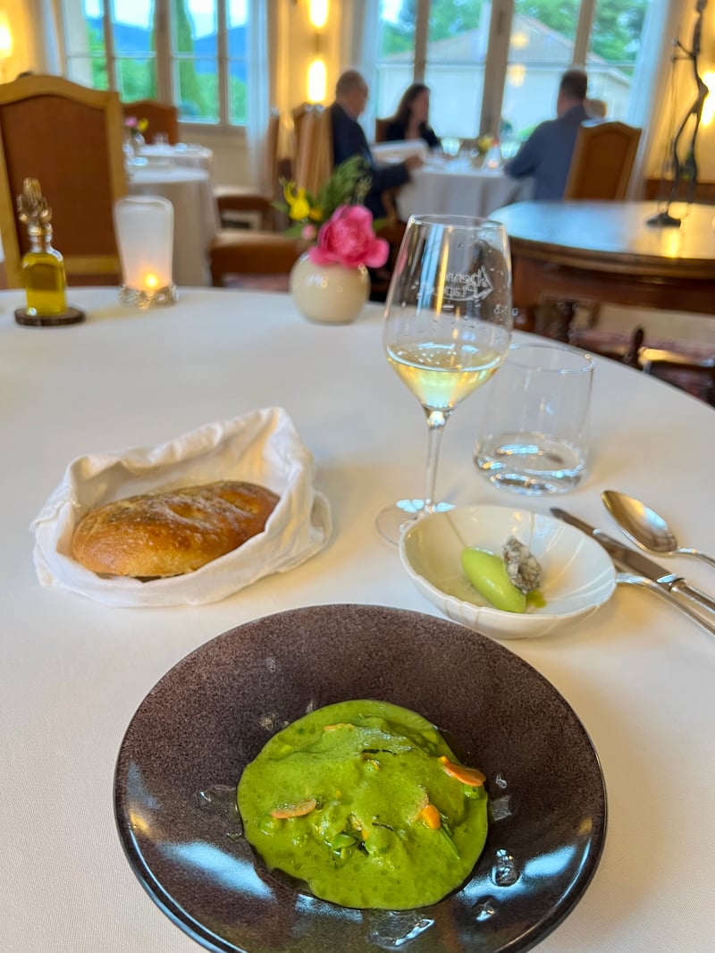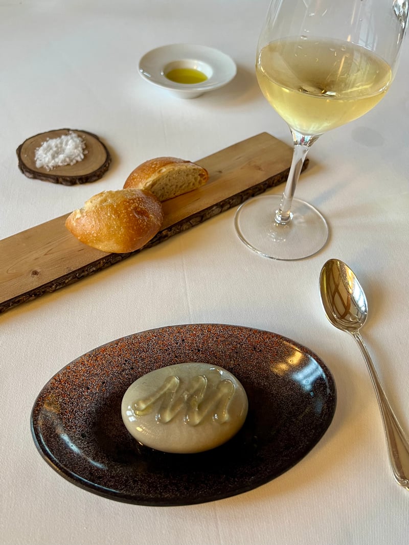 The meal continued with a dish as poetic in presentation as it was delicious: the Durance Pebble with Banon cheese and génépi gel. This smooth, shiny pebble, inspired by stones polished by the river, concealed a creamy heart of Banon cheese, whose milky sweetness was delicately lifted by a drizzle of génépi gel. The slightly bitter herbal note added complexity and freshness. Homemade bread, fleur de sel and olive oil perfected this sensory pairing. This dish paired beautifully with an Originelle Mondeuse Blanche from Domaine Philippe Grisard, a rare white wine from Savoie with subtle aromas of flowers and lemon.