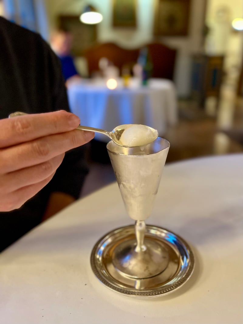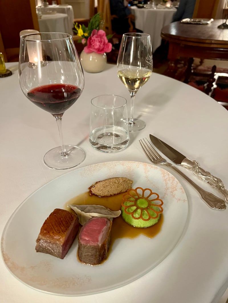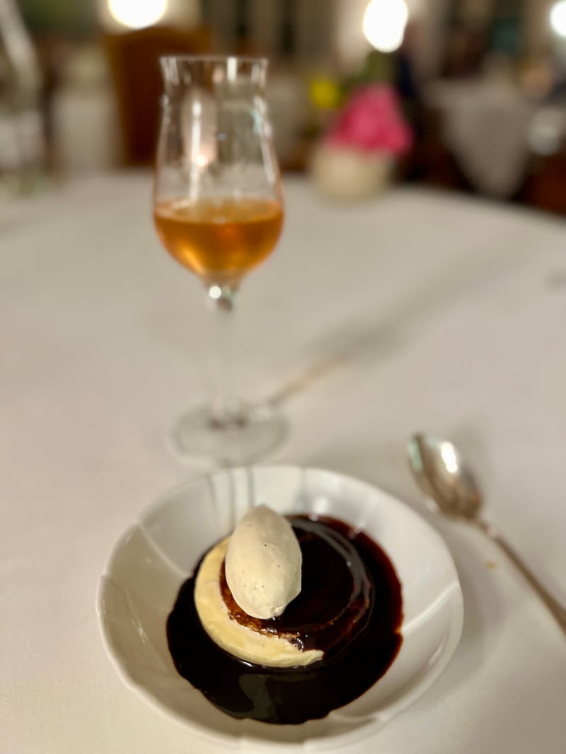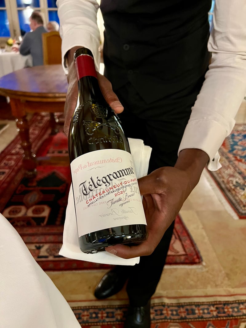 To mark a refreshing pause, Magalie's sorbet, wine-based, was served in a frosted glass on a silver tray. Light and thirst-quenching, it offered a moment of purity and delicacy, ideal to prepare the palate for the rest of the feast. The moment of great flavours arrived with the roasted lamb seared over a fierce flame, accompanied by a Châteauneuf-du-Pape "Télégramme" 2021 from the Brunier family, a generous red with notes of ripe fruit and spices, perfect to support the richness of the dish. The meat, pink and perfectly caramelised, was accompanied by a vegetable flan topped with a crispy lace, a melting ravioli and a tasty quenelle, illustrating all the know-how of La Bonne Étape's kitchens.