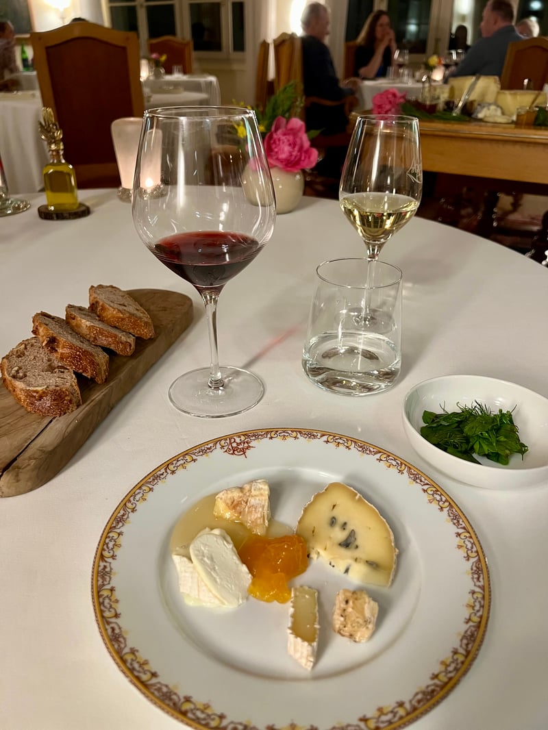 The cheese trolley extended this experience with a remarkable selection: fresh and matured goat's cheeses, pressed and blue cheeses, washed-rind and local specialities, some even produced in the village. Dried fruits, jams and honey accompanied this platter for a generous and authentic tasting.