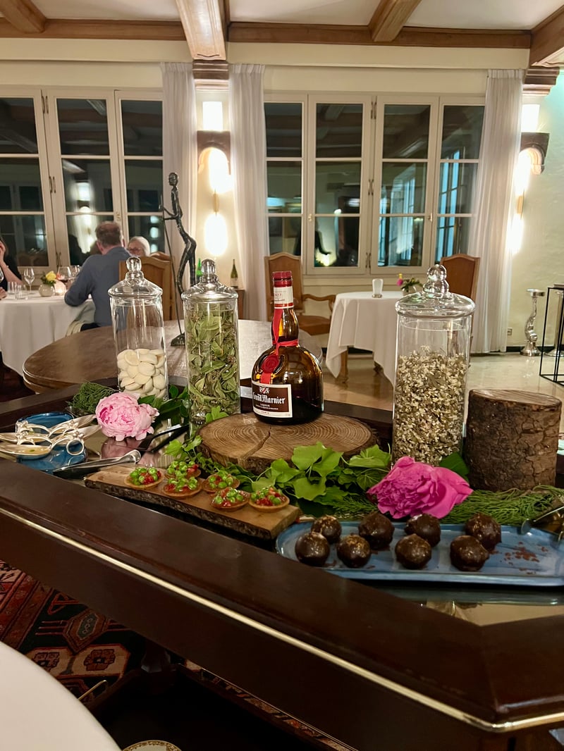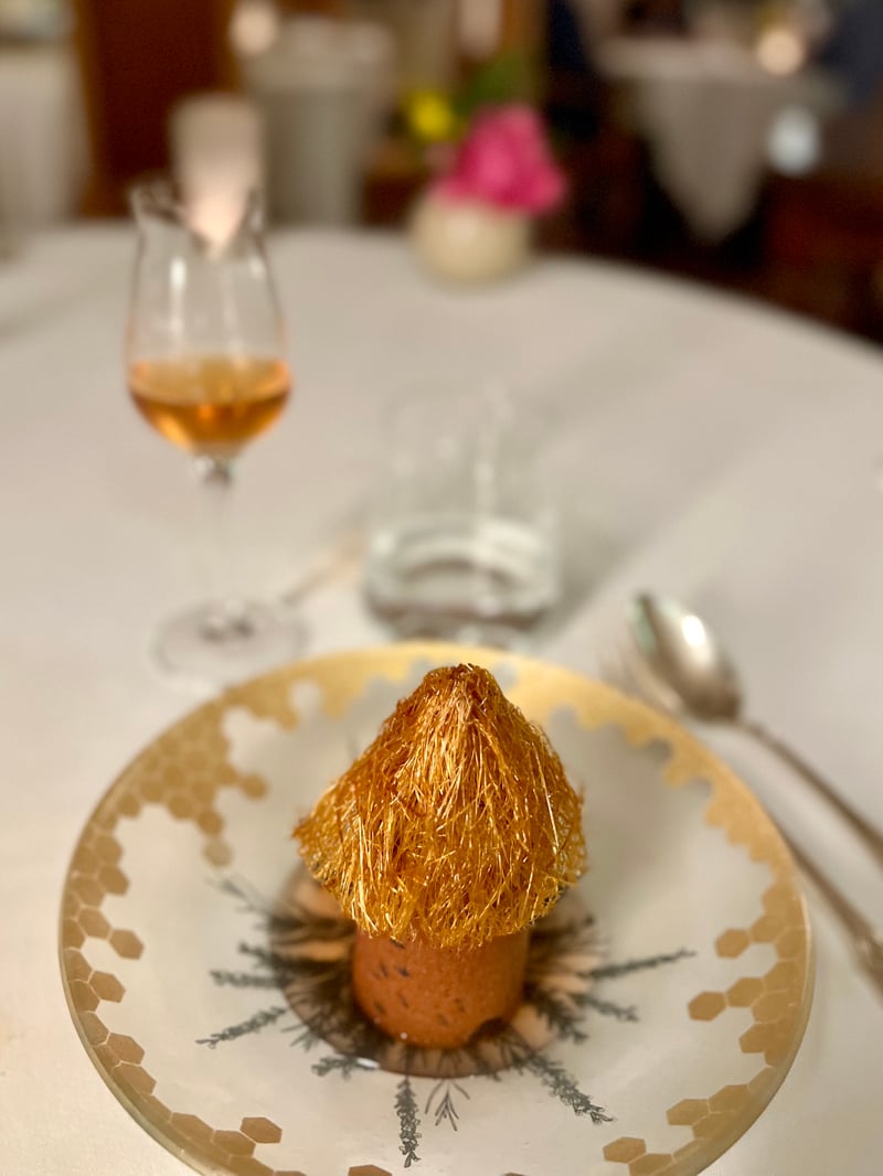 The sweet part opened with the White Soufflé and cocoa rain, an airy and indulgent dessert where the lightness and freshness of a vanilla ice cream quenelle met the intensity of a melting chocolate sauce. The 2019 Muscat de Beaumes-de-Venise from Domaine des Bernardins, with aromas of candied fruit and honey, complemented this sweetness elegantly. To conclude in style, the lavender honey ice cream in its hive charmed with its play of textures and spectacular presentation: a smooth ice cream delicately flavoured with lavender, sheltered under a fine cage of spun caramel. The mignardises trolley, a true garden of delights, finally offered one last moment of pleasure: shiny truffles, mini fruit tarts, herbal sweets and other artisanal creations, served in a setting of foliage and flowers, for a gourmet finale as generous, refined and unforgettable as the meal itself.