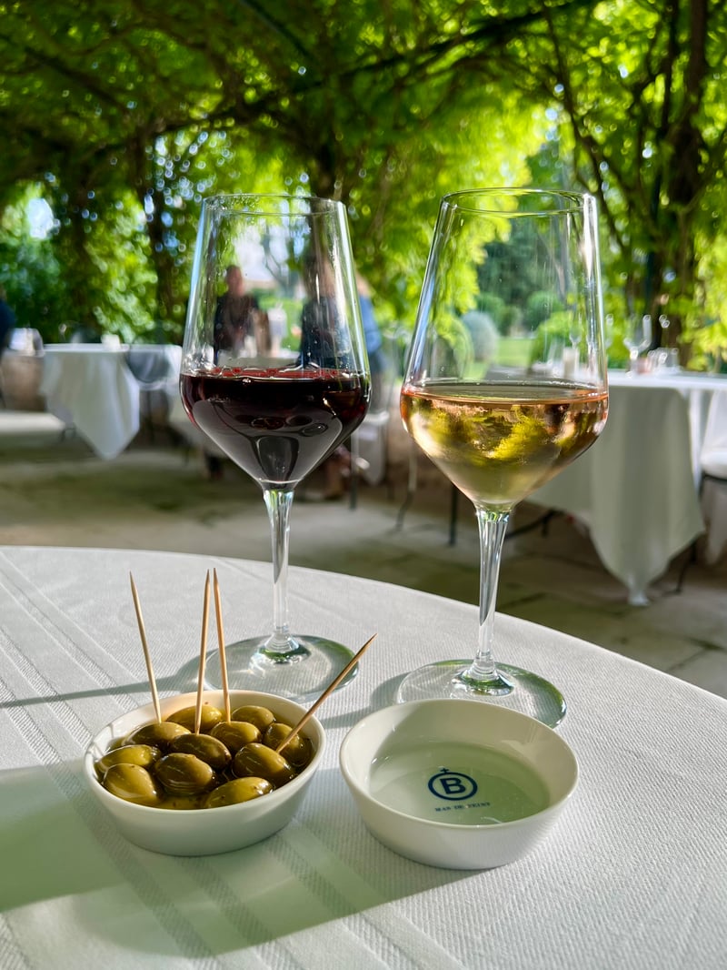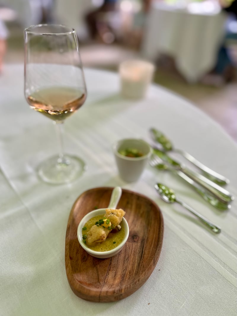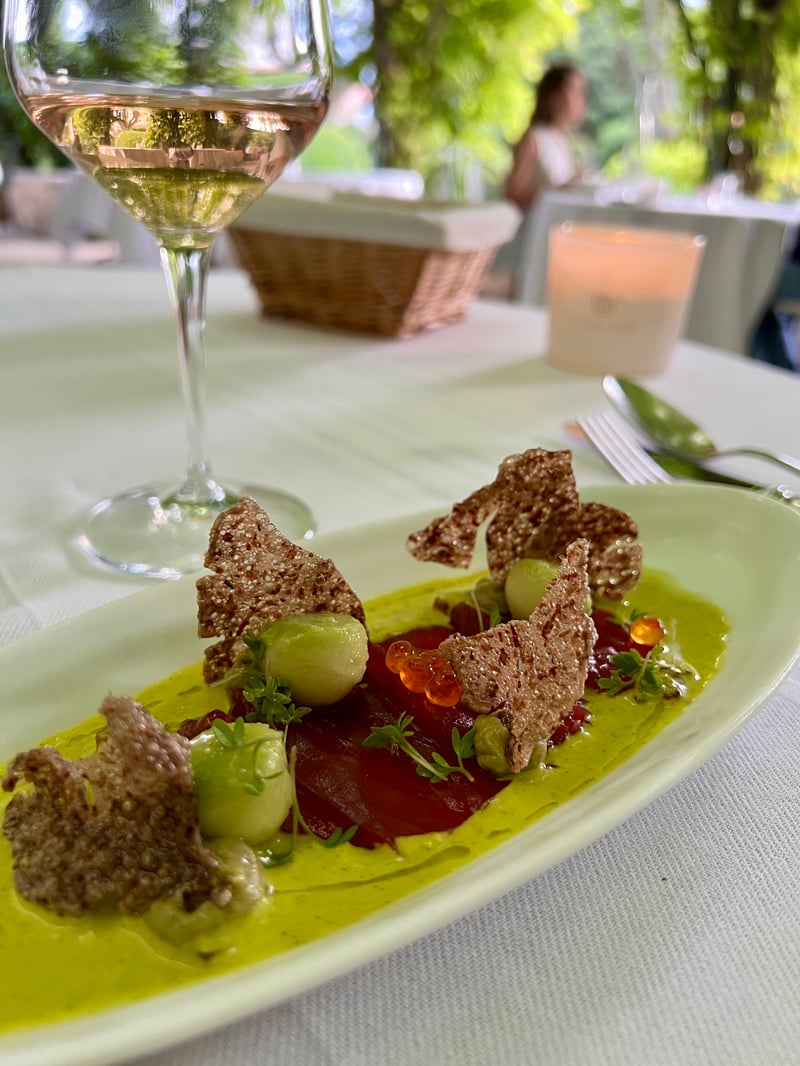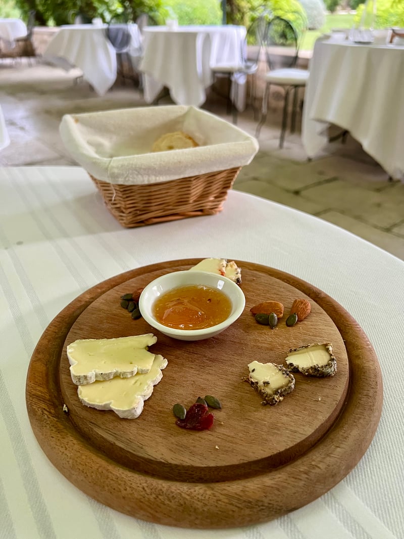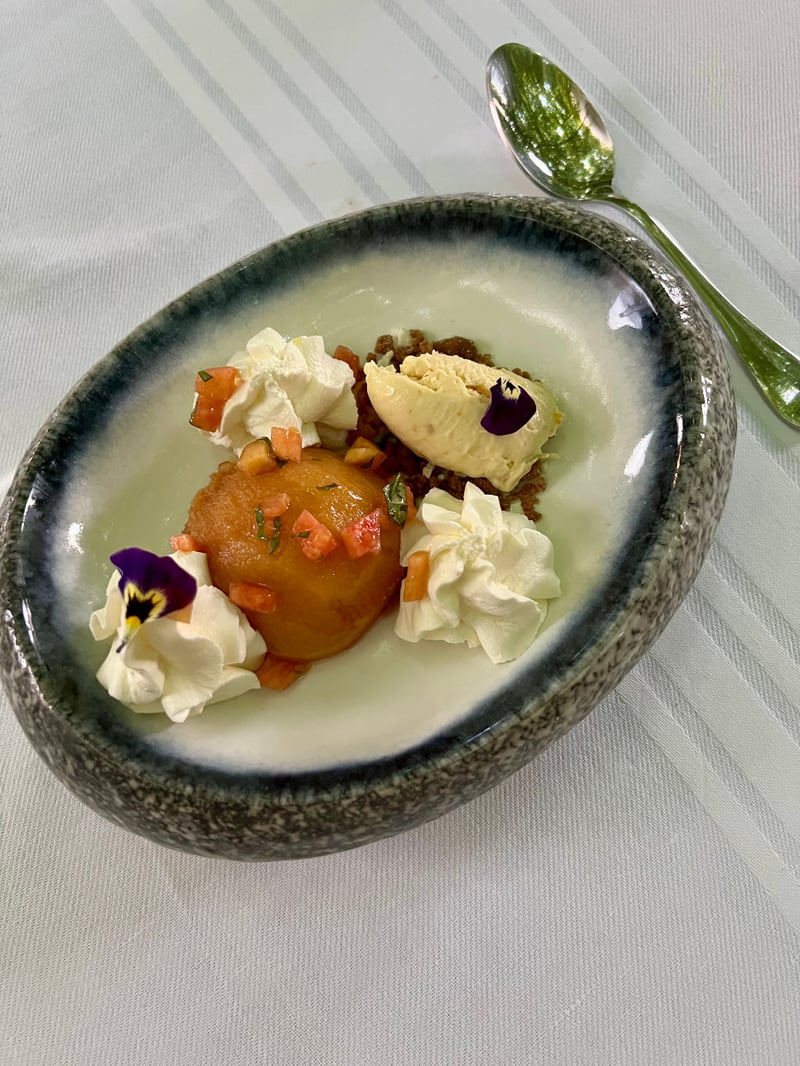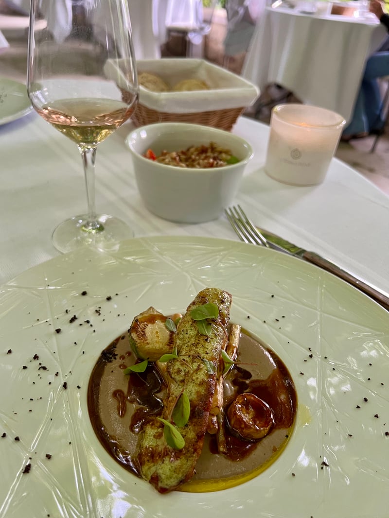 Our dinner began with an amuse-bouche inspired by the day's market, immediately revealing the chef's creativity. As a starter, a Nikkei-style tuna sashimi masterfully combined ocean freshness with global flavors, subtly evoking Peru and Japan. The main course, a herb-crusted poultry supreme, came with red rice grown on the estate and butter beans, all covered in a refined mushroom sauce. The selection of aged cheeses honored local craftsmanship. Finally, the sweet note came from a delicate, reinvented Pêche Melba—light, fruity, and a refined nod to a classic dessert.