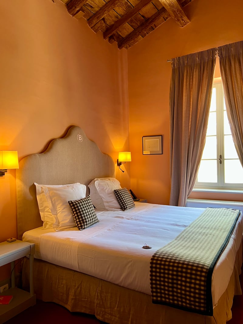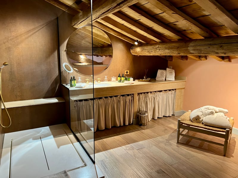 During our stay, we stayed in an Elegance Room, located under the eaves with magnificent exposed beams. Spacious and bright, it featured an exceptionally comfortable Maxi-King Size bed and a beautiful mezzanine bathroom accessible via a discreet little staircase. Every element, from the chosen fabrics to the decorative objects, reflected a rare attention to detail. The “B” emblem, representing the family manade, was discreetly present: embroidered on the bedding and printed on the towels.