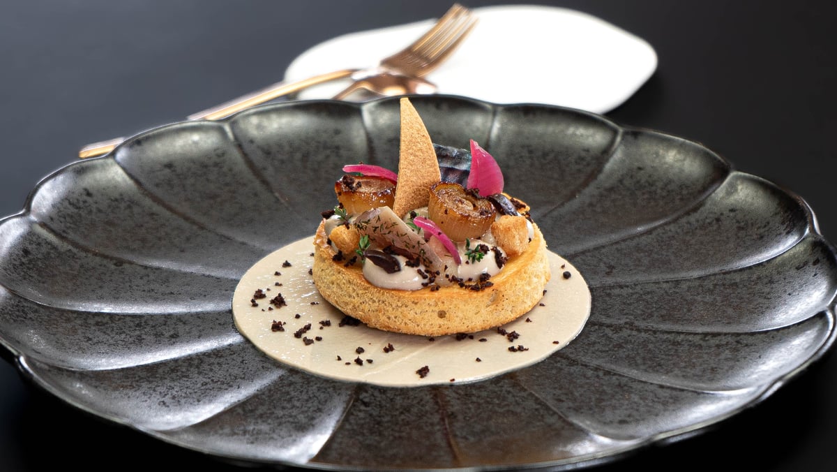 The first course differs for each of us. For my husband, a starter featuring the green asparagus “La Voluptueuse” from Mallemort. Elegantly plated, it rests on a crispy base and is accompanied by mountain ham shards, organic egg, and a creamy mushroom-yellow wine sauce. On my side, I discover a 2025 version of pissaladière, a bold reinterpretation of a Mediterranean classic. On a brioche-like base, melting sweet onions combine with a light anchovy spread and Taggiasca olives, accented with crispy capers, edible flowers, and fresh herbs. A delicate creation between tradition and modernity.