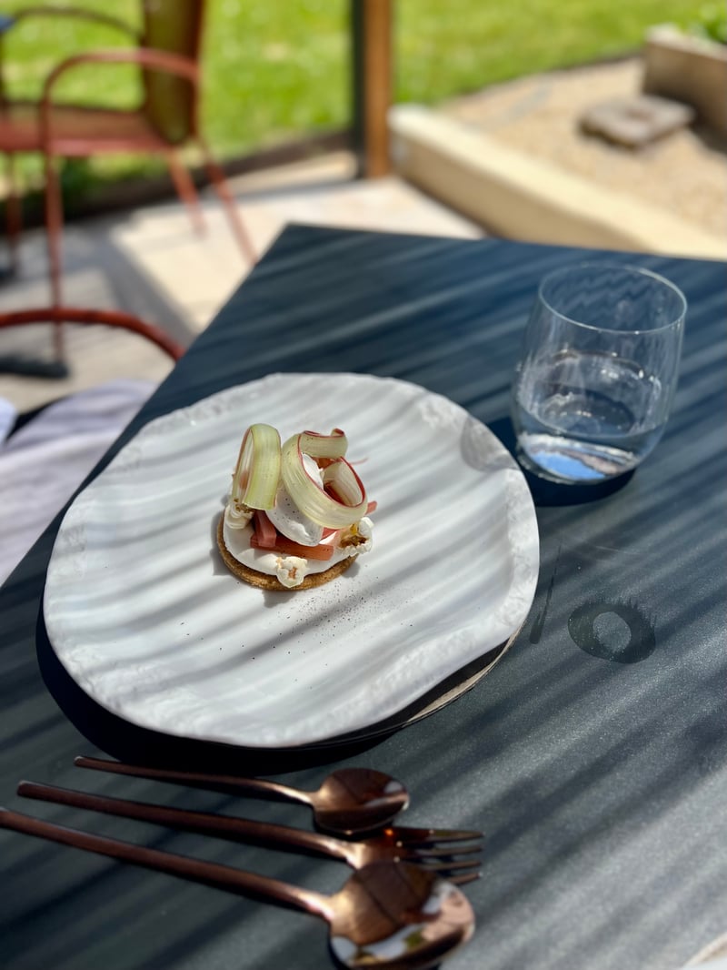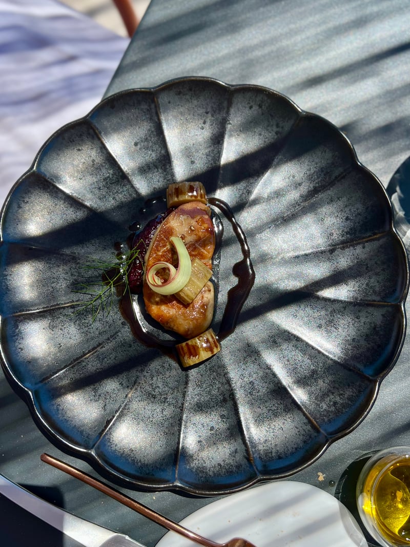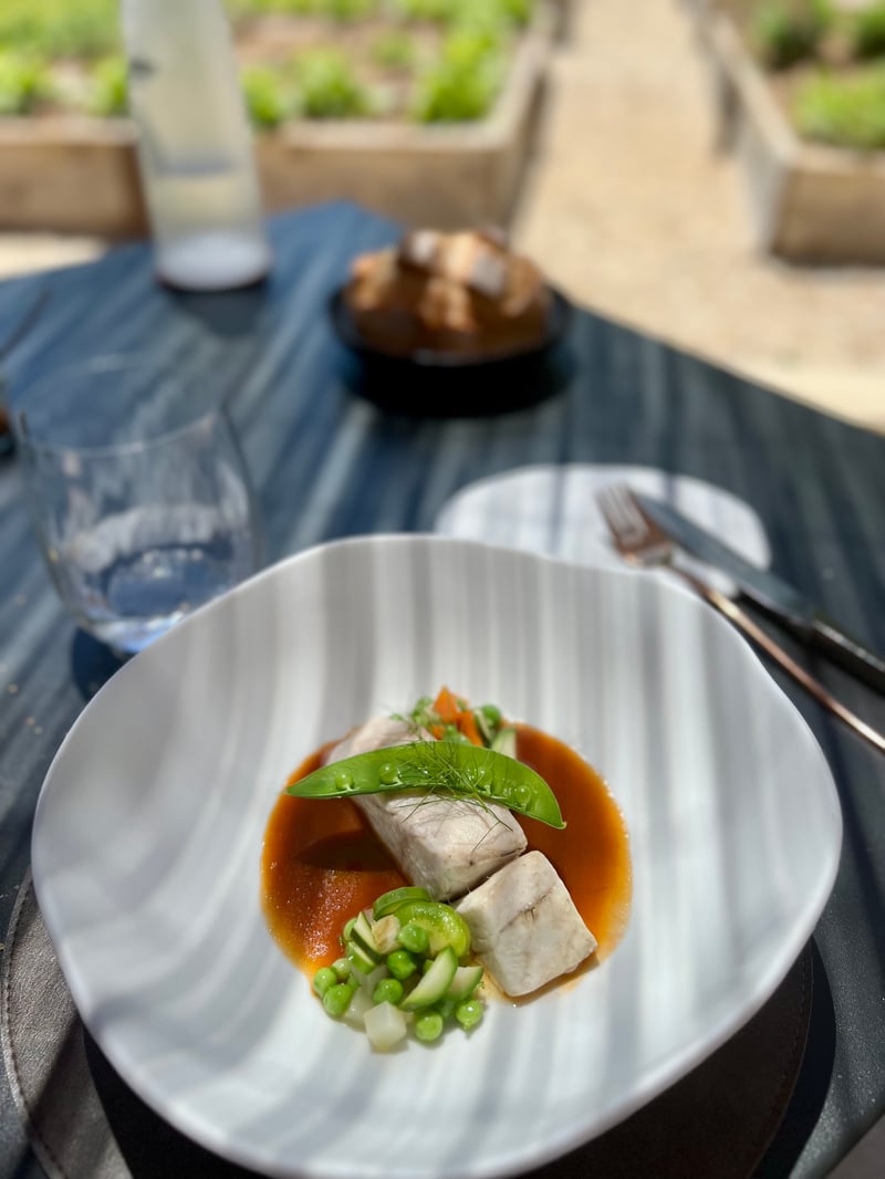 The meal continues with a generous plate for my husband: foie gras from Gers, simply pan-seared with Amaretto. The cooking is perfectly mastered, the texture melting, and the accompaniments — sour cherries, rhubarb, and almonds — bring fruity acidity and a delicately dosed liqueur aroma. For me, a more delicate dish follows: Mediterranean meagre, gently steamed. Set on an organically shaped plate, it is surrounded by a springtime garden: crunchy peas, carrots, snow peas, spring onions, and fresh herbs. The fish bone jus with pea pods, intense and vegetal, underscores this balanced cuisine, in resonance with the garden visible from the dining room.