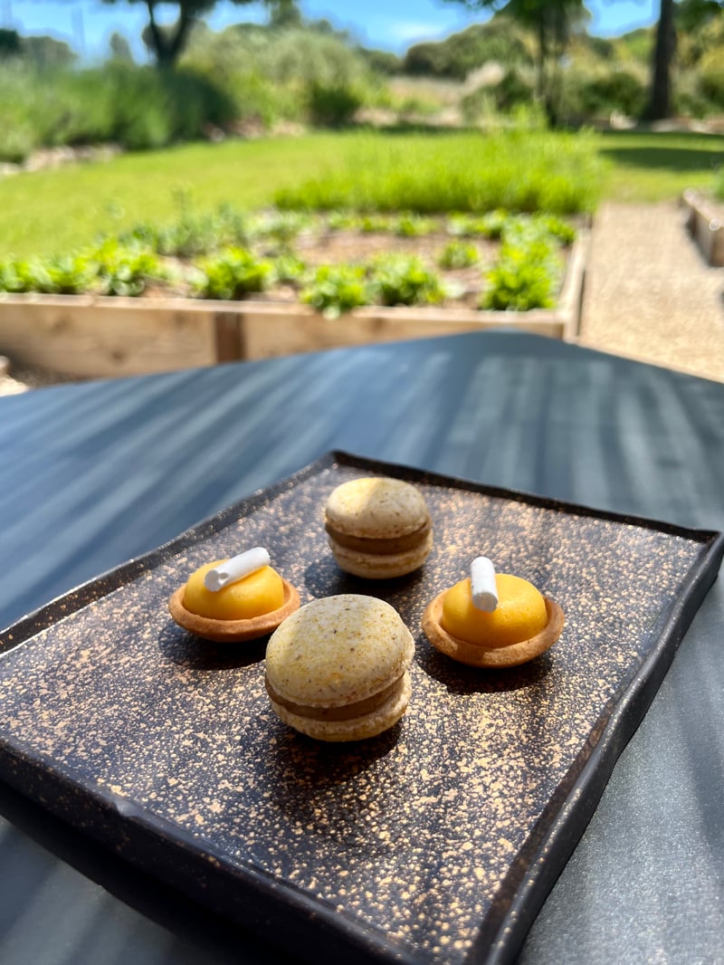 The meal concludes with a selection of mignardises. The passion fruit tartlet, shiny and sunny, is topped with a crunchy meringue stick. The praline-kumquat macaron combines nutty sweetness with fruity bitterness. A perfectly executed duo, to be savored facing the garden, to extend this suspended moment a little longer.