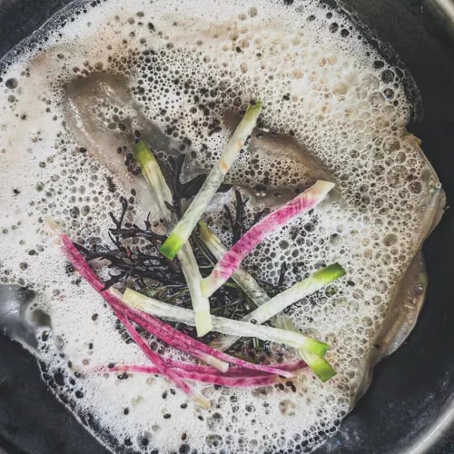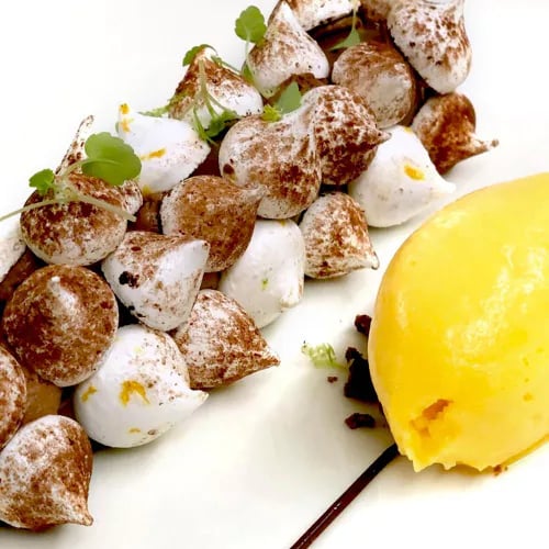 Behind a burgundy façade steps from the château, two alumni of Tours hospitality school have built a Bib Gourmand address celebrating Loire Valley terroir. Roi Rose pork, seasonal asparagus, and local goat's cheese anchor a menu where roasted scallops arrive with cauliflower and vanilla oil, and a lemon tart gains complexity from dried black lemon. Contemporary bistro cooking, confidently executed.