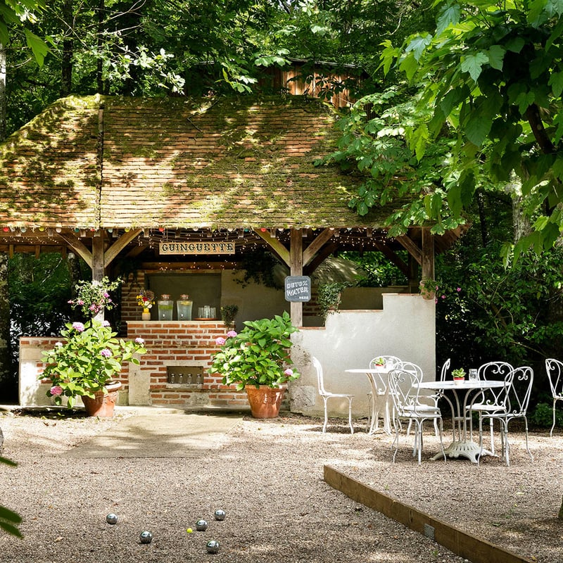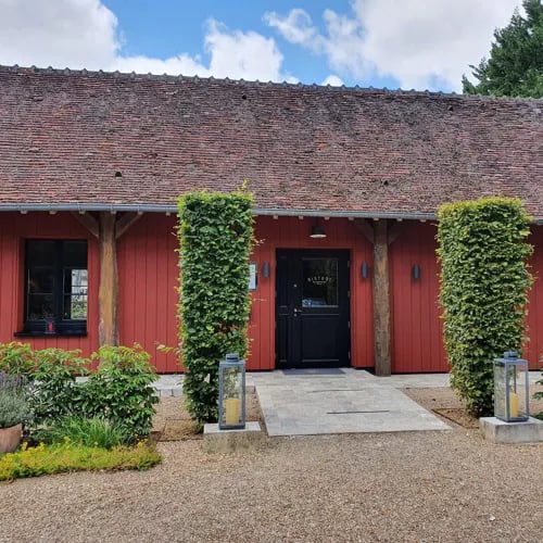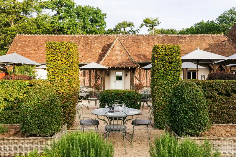 Exposed timber beams and weathered oak floorboards define this atmospheric Sologne outbuilding on the Hauts de Loire estate. The kitchen garden unfolds directly from the terrace, supplying produce for a menu that oscillates between honest bistro plates—aged beef, spit-roasted meats—and the chef's more inventive preparations. A Michelin Plate address suited to unhurried Loire Valley afternoons.