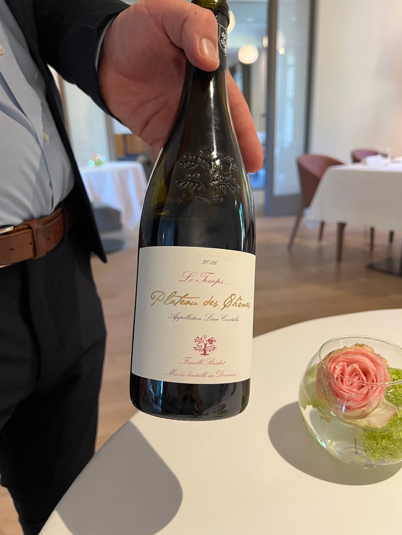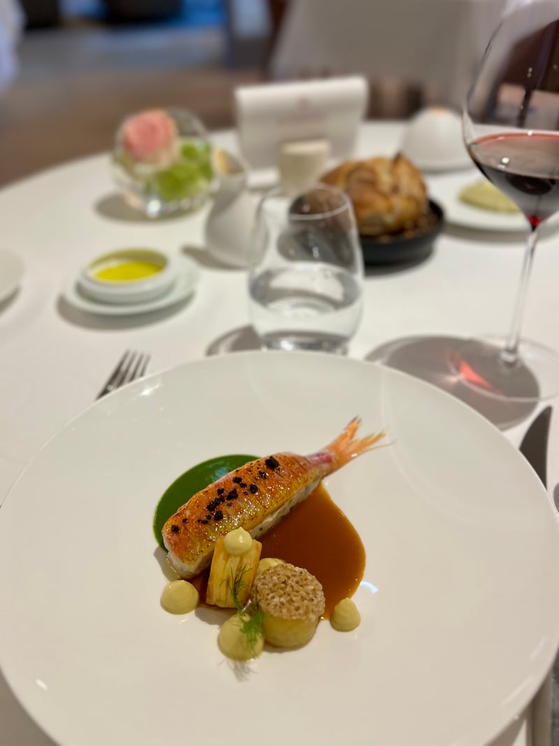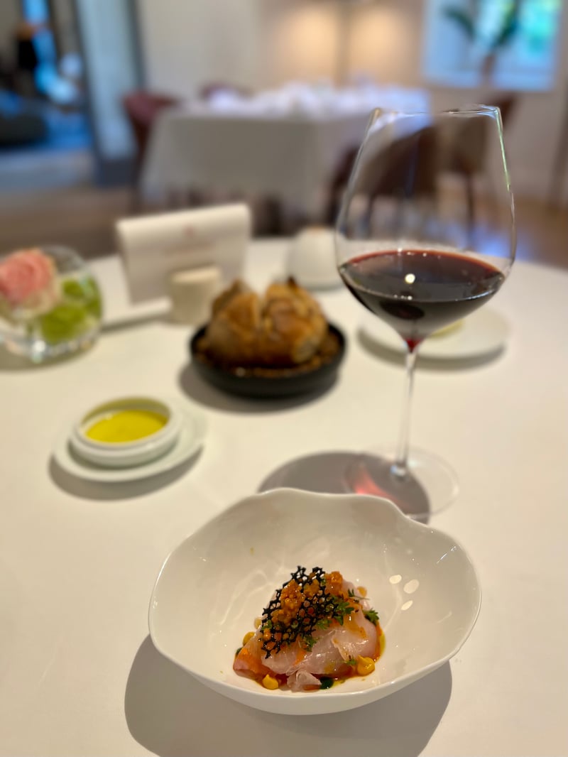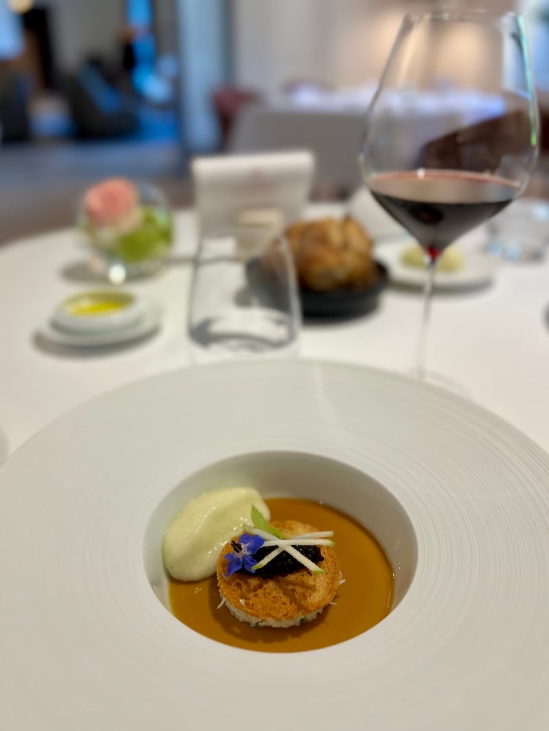 In a more indulgent register, the crab, precisely shredded, was presented under a crispy disc topped with green apple slices, crunchy celery, and a generous spoonful of oscietra caviar. At the bottom of the plate, a silky bisque rich in aromas enveloped it all with great depth. A light foam softened the whole, while the selected red wine brought a lovely structure without masking the crustacean's elegance.